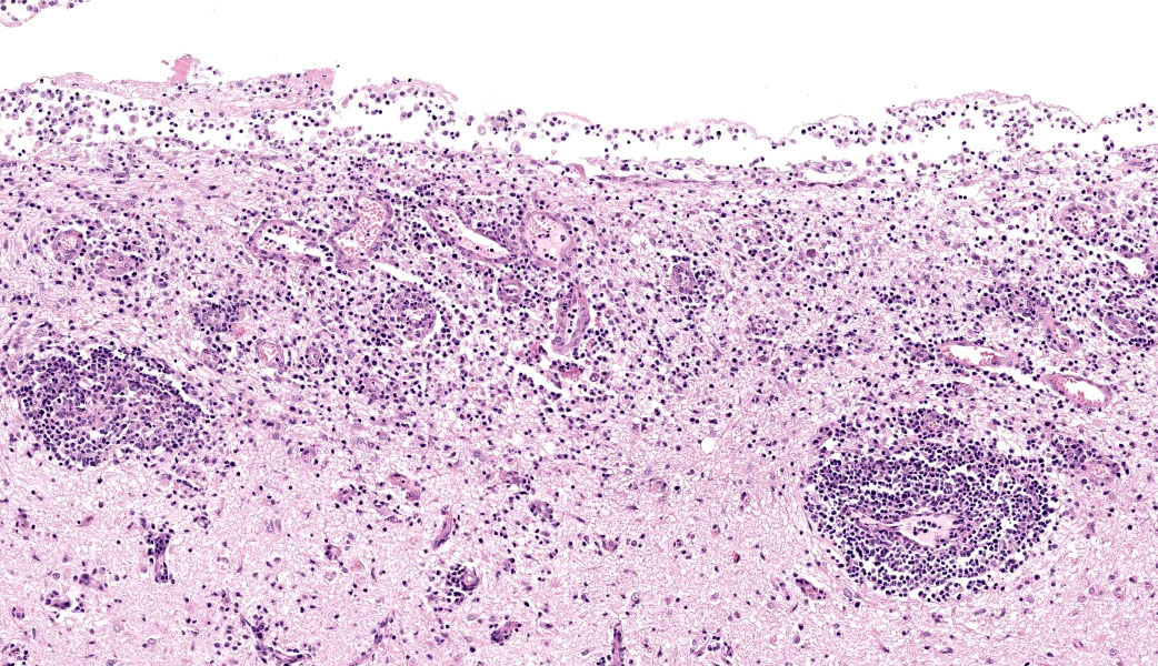 Brain: The meninges are moderately expanded by macrophages, plasma cells, and lymphocytes that surround and partially obscure reactive meningeal vessels. Inflammatory cells extend around vessels into the subtending parenchyma, filling and expanding Virchow Robin spaces up to 12-15 cell layers thick. There are focal areas of infiltration of macrophages, lymphocytes, and plasma cells into the surrounding parenchyma with associated vacuolation and necrosis of the parenchyma, neuronal satellitosis and necrosis, infiltration of gitter cells, gliosis, and astrocytosis. Isolated within the parenchyma and associated with areas of inflammation and necrosis are numerous 12 to 45-µm diameter protozoal cysts containing closely packed clusters of 1 to 2-µm wide, crescent-shaped bradyzoites. At the level of the corpus striatum, there is vacuolation of white matter tracts with occasional spheroids, digestion chambers, and numerous protozoa. Vessels adjacent to the lateral ventricle are obscured by macrophages, lymphocytes, plasma cells, and neutrophils with indistinct, hypereosinophilic vascular walls (necrosis) and perivascular exudation of fibrin and edema. The ependyma spanning the lateral ventricle is segmentally discontinuous with disruption by inflammatory cells and necrotic material that extend into the ventricular lumen.