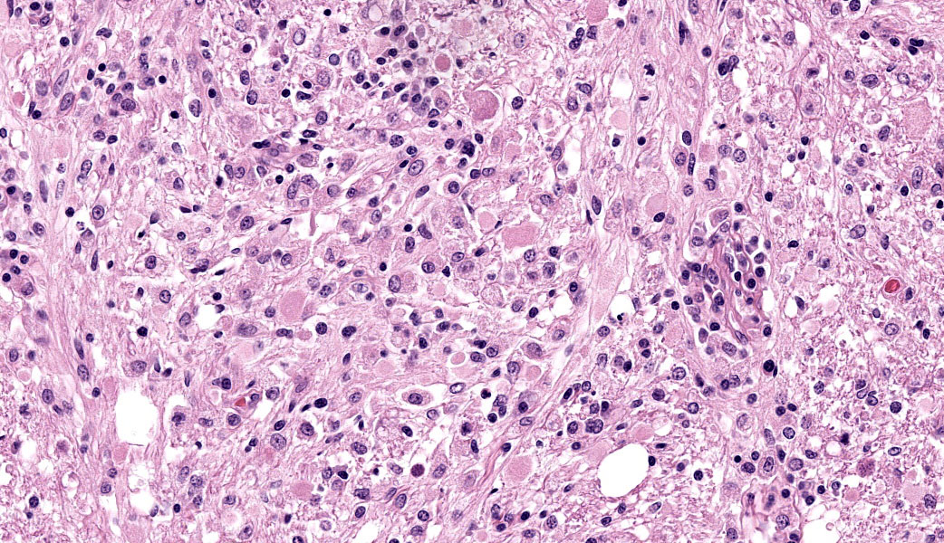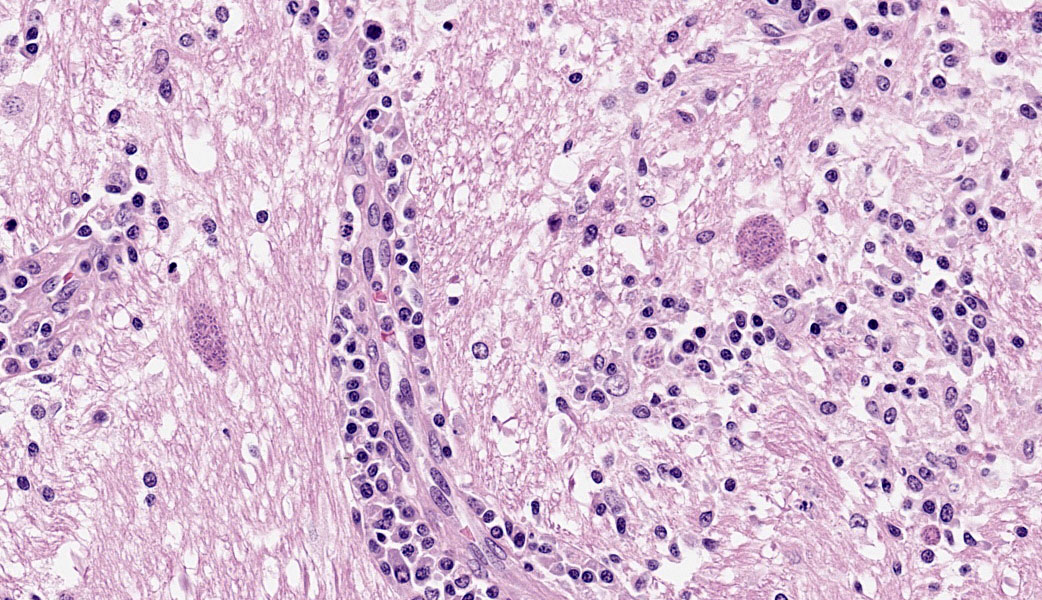 Central nervous system disease is more common in young or immunosuppressed individuals and is difficult to differentiate histologically from Neospora caninum, Sarcocystis spp., or Encephalitozoon cuniculi, thus requiring additional testing modalities (immunohistochemistry, PCR, and/or special histochemical staining) to differentiate.4 However, observing necrosis in multiple organ systems associated with the presence of protozoal infective stages is most suggestive of toxoplasmosis.7