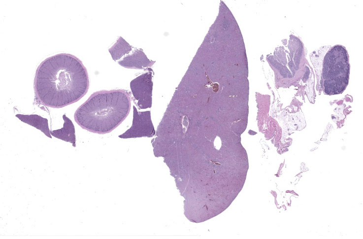 Postmortem and body condition were good with mild autolysis and moderate fat stores. The liver was enlarged filling much of the coelomic cavity and mottled shades of tan and brown. The spleen was enlarged at 3 x 0.5 x 0.5 cm. The upper gastrointestinal tract was empty and the small and large intestinal loops were diffusely mildly dilated.