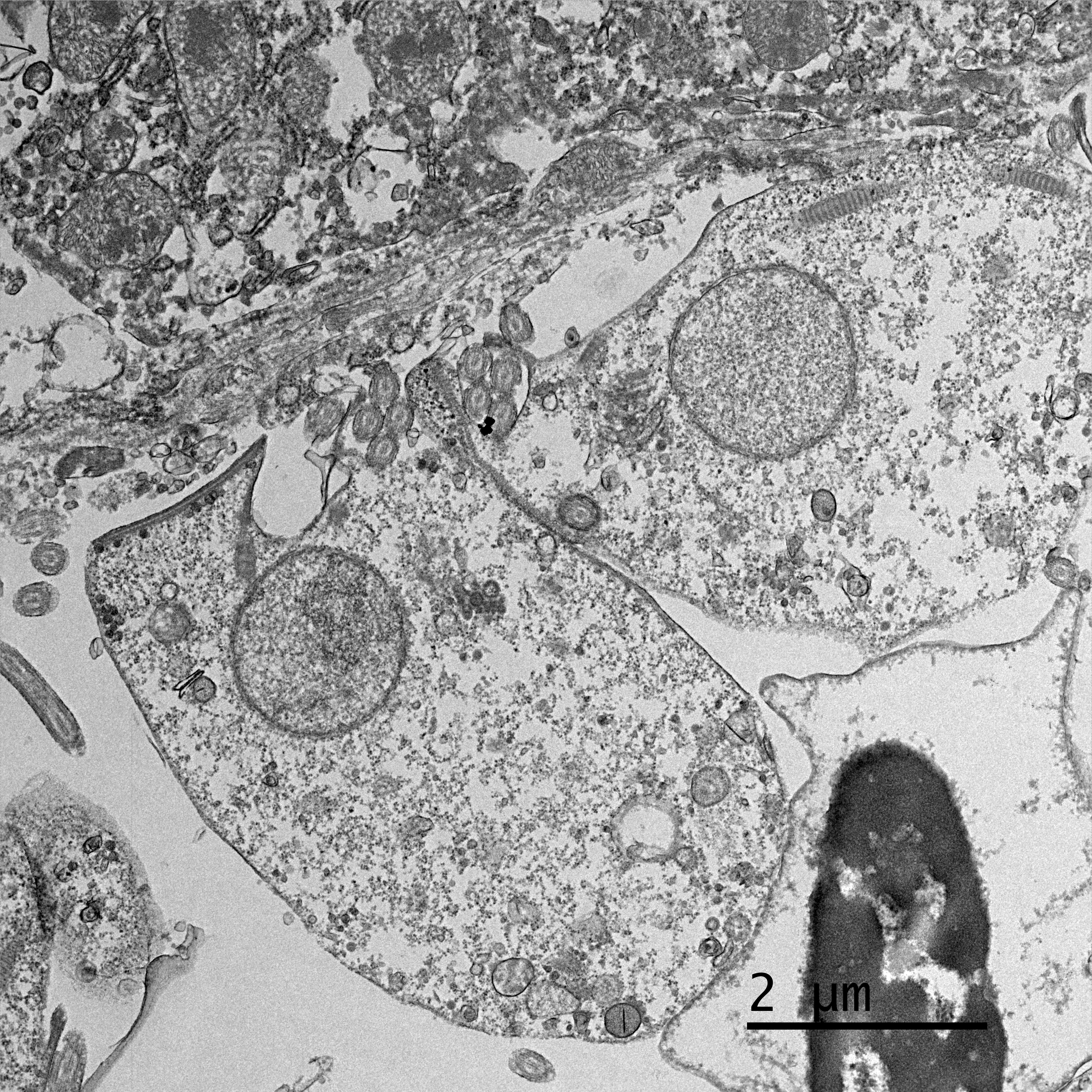 Finally, Dr. Pesavento quizzed participants on the ultrastructural images from this case, which was an appreciated, succinct review for many attendees. Key takeaways from this discussion included trusting your anchors (i.e. erythrocytes, nuclei, etc.), determining the number of cell profiles in the EM image, and knowing what normal looks like so you can evaluate the abnormal. The protozoal organisms on EM had some key characteristics to look for, as well, including the flagella on the Trichomonads with their classic microtubule 9+2 arrangement, and the apicomplexan conoid, rhoptries, and micronemes within the Isospora.5,6 Her last piece of wisdom in this case regarded microvilli on EM: don't call them microvilli unless you can see the actin microfilaments holding them up. If not, they are termed "cellular projections."