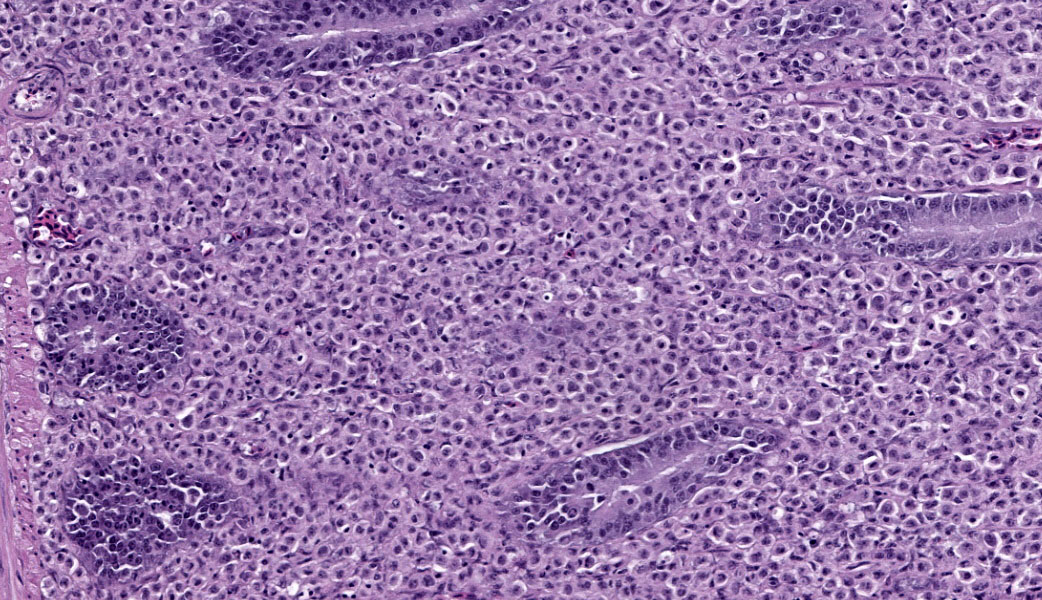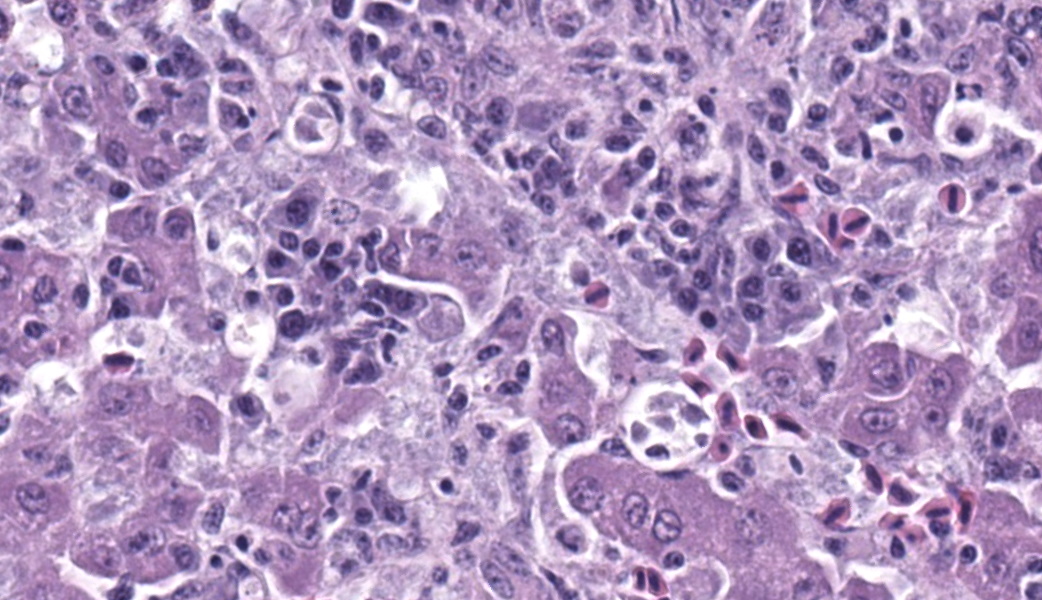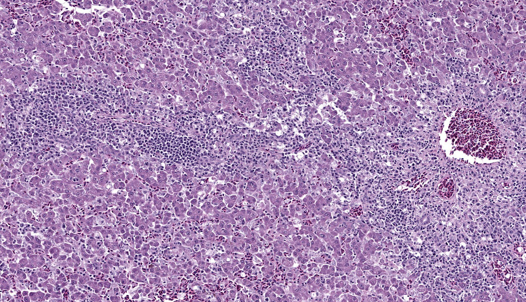 This case provided a nice example of granulopoiesis in the liver, characterized by granulocytes that lacked a bilobed nucleus and clustered with hematopoietic precursors. It is easy to overlook or over-interpret extramedullary hematopoiesis, but knowing which species it is normally and commonly seen in is important. Birds, reptiles, and some rodents can routinely have foci of EMH in their livers. There was additionally some beautiful tertiary lymphoid follicle development in this case secondary to the chronic inflammation!