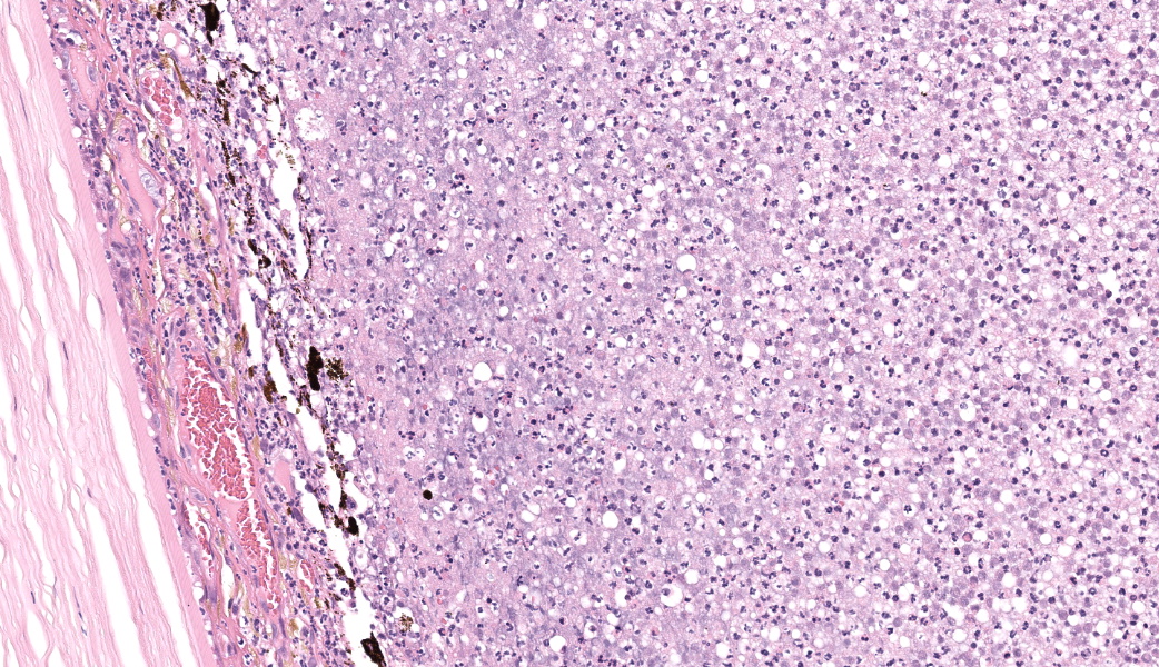 Filling all ocular chambers and coating the surfaces of intraocular structures are vast accumulations of exudate consisting of myriad degenerate and intact neutrophils, many macrophages, abundant amounts of fibrinous to proteinic material, abundant necrotic cellular debris, occasional pools of extravasated erythrocytes, and multifocal colonies of mixed bacteria (rods and coccobacilli). Centrally incorporated into the inflammatory exudates is a ruptured lens which lacks a capsule in many areas and has highly undulating free capsule margins regionally. The lenticular stroma is variably vacuolated with the following features: streaks of pallor, Morgagnian globules, many infiltrating leukocytes (mostly neutrophils), and occasional pockets of similar bacteria. The retina is diffusely detached and largely inapparent apart from remnant segments of atrophied and degenerate retina enmeshed within the exudate. Suppurative to pyogranulomatous inflammatory infiltrates multifocally extend into the iris, ciliary body, choroid, optic nerve which is significantly gliotic with rarefied neuropil, and optic nerve meninges. The iris is displaced anteriorly and multifocally abuts the posterior aspect of the cornea. The anterior chamber is severely narrow, and the drainage angle is collapsed and inapparent. The corneal stroma is moderately to markedly oedematous and contains small to moderate numbers of scattered neutrophils. The anterior corneal epithelium appears attenuated in areas. The sclera is variably thinned with multifocal often perivascular infiltrates of lymphocytes and plasma cells with variable numbers of admixed neutrophils and occasional macrophages. There are increased numbers of perilimbal pigmented cells. A thin to moderately thick layer of oedematous and inflamed granulation tissue regionally lines the mid and posterior scleral margins outside the globe and extends into a bundle of periocular skeletal muscle. In addition to infiltrates of the aforementioned inflammatory cells, the granulation tissue also contains many golden-brown pigmented macrophages (siderophages) which are concentrated at the level of the ciliary body. There is abundant haemorrhage in the retrobulbar loose connective tissue.Contributor's Morphologic Diagnoses: