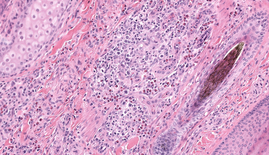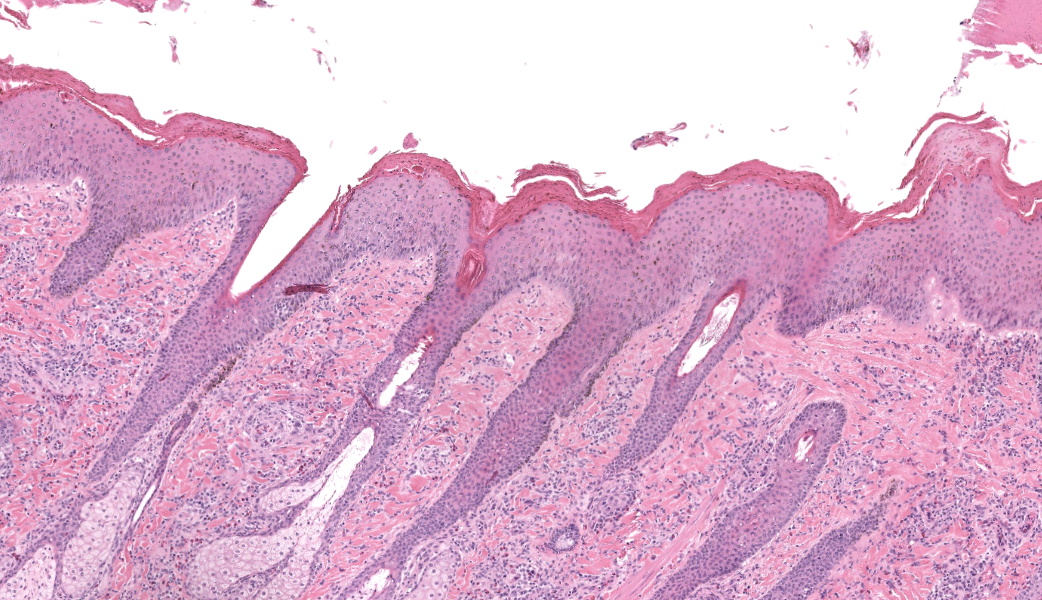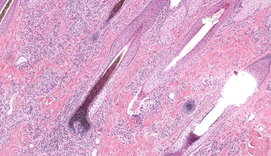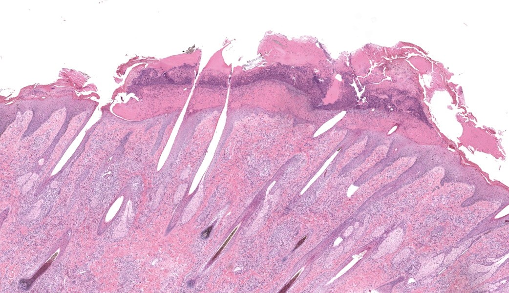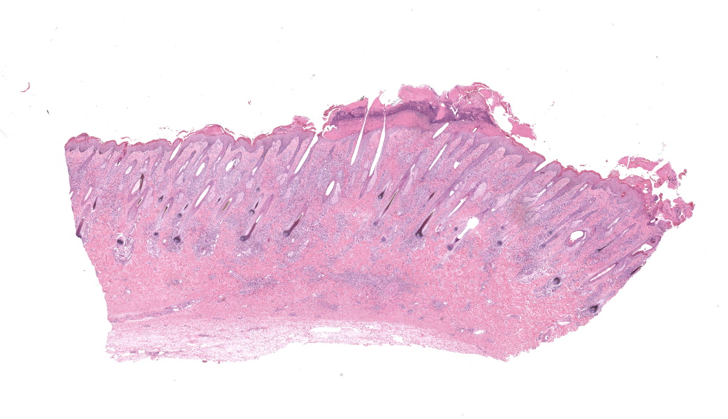 Haired skin, coronary band. Expanding and infiltrating the entire dermis are multifocal to coalescing perivascular, periadnexal and interstitial aggregates of moderate numbers of lymphocytes, eosinophils and histiocytes, fewer plasma cells and occasional neutrophils. Multifocally within dermis are few small areas of intensely eosinophilic, fragmented collagen fibers admixed with eosinophilic cellular- and basophilic nuclear debris, surrounded by epitheloid macrophages and multinucleated giant cells (eosinophilic granulomas). Intramurally and intraluminally within multiple hair follicles are moderate numbers of eosinophils, lymphocytes and histiocytes and few multinucleated giant cells (mural and luminal folliculitis), and adjacent follicular epithelium display moderate spongiosis. In the dermal-epidermal interface, there is a multifocal mild edema. The epidermis shows mild lymphocytic infiltration, mild spongiosis and occasional apoptotic keratinocyte, diffuse mild acanthosis and mild rete ridge formation (epidermal hyperplasia), moderate parakeratotic and orthokeratotic hyperkeratosis and multifocal erosions and ulcerations, the latter being covered by large serocellular crusts spanning over several adnexal units. Serocellular crusts show abundant viable and degenerated neutrophils, occasional eosinophil, cellular debris, fibrin, free keratin and hair fragments and occasional small basophilic bacterial colonies. There are also small epidermal intracorneal pustules multifocally. Several arteriolar walls in deep dermis show infiltration of few eosinophils and lymphocytes (vasculitis). The deep dermis displays mild diffuse edema.Contributor's Morphologic Diagnoses: