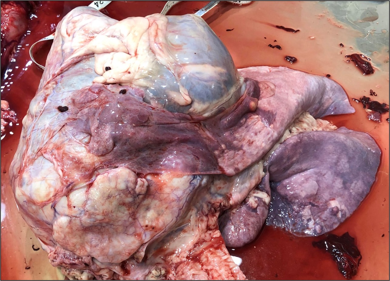 The owners report weight loss and cough for a few weeks. When auscultated, muffled heart sounds were heard on the right side, but no heart sounds were heard on the left side. Crackling sounds were heard in the dorsal lung fields but lungs sounds were absent ventrally. The owners elected for euthanasia and the goat was sent for a postmortem.Gross Pathology: