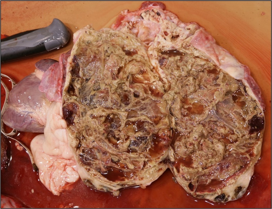The goat was thin with small visceral and subcutaneous body fat stores. Moderate clear edema expanded the subcutis and deeper soft tissues along the ventral aspect of the mandibles, the ventral neck and the ventral trunk (dependent edema). Approximately 500 mls of orange-tinged fluid containing a few strands of fibrin was present in both the thoracic and abdominal cavities. Approximately 500 mls of similar fluid also distended the pericardial sac. An approximately 24 cm in greatest diameter, mass expanded the cranial mediastinum and filled the cranioventral thorax, displacing and compressing the lungs caudodorsally. When sectioned, much of the center of this mass was brown, necrotic and composed of many cystic pockets filled with yellow-brown clear fluid intermingled with pale yellow-tan, friable, debris. A thin peripheral layer of relatively intact tissue was generally present just beneath the variably thick layer of dense fibrous tissue which surrounded the mass. Portions of the cranioventral lung lobes were attached by extensive fibrous pleural adhesions to the outer surface of the mass. The pulmonary parenchyma was pale pink, partially collapsed and contained numerous, firm, randomly scattered, nodules ranging in size from 0.7-2.5 cm in greatest diameter. The base of the pulmonary trunk was markedly dilated just proximal to where it entered and passed through the large mediastinal mass. The right ventricular lumen and the right atrium were also markedly dilated. Mediastinal lymph nodes were unremarkable. The liver was diffusely dark red, moderately enlarged and when sectioned had a prominent red brown to tan, reticular (or nutmeg) pattern.Laboratory Results: