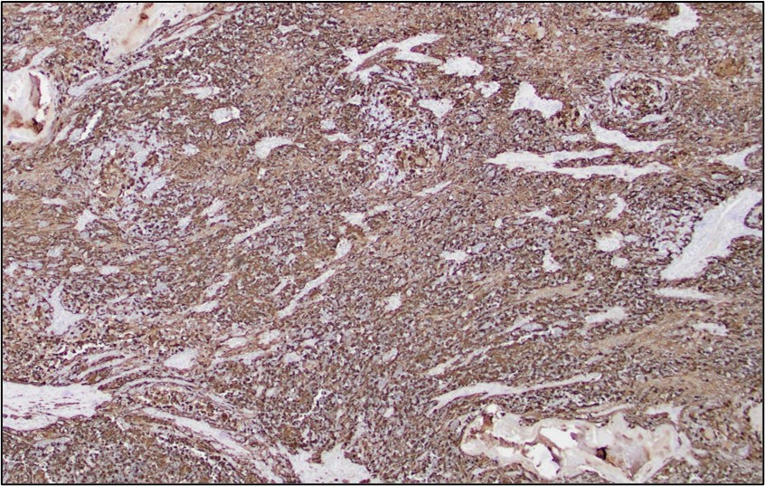 Immunohistochemistry on sections of the mediastinal mass was performed; see microscopic description.Microscopic Description: