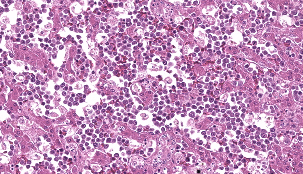 This case proved to be challenging for participants given that the condition is relatively obscure and requires IHCs for definitive diagnosis. Leukemia and leukemic lymphoma were the top diagnoses considered by conference participants prior to case discussion. The contributor provides an excellent overview of and a convincing diagnostic workup for the diagnosis of avian erythroblastosis in their comment. An in-house hemoglobin IHC at the JPC similarly revealed moderate cytoplasmic immunoreactivity for hemoglobin within the neoplastic cell population and no immunoreactivity of neoplastic cells for lymphocyte markers (CD3, CD20, PAX5, CD34). This entity, and its accompanying histologic findings, provided great discussion of oncogenic viruses and intravascular round cell neoplasms of avian species. “Intravascular round cell neoplasm” was ultimately the morphologic diagnosis that was favored by the JPC due to the inability to reach the diagnosis of erythroblastosis on the H&E slide alone (the JPC morphologic diagnosis is always based on the HE section, which is the only section provided in advance of the conference.)Conference discussion focused largely on avian leukosis virus and its subtypes. Avian leukosis viruses (ALV) are alpharetroviruses that are usually slowly oncogenic. Subtype A is the most common, and subtypes A through E, as well as J, are known to infect chickens. Other subtypes affect numerous other species of birds. These viruses cause a variety of neoplasms by inserting themselves as promoters into the affected chicken’s genome near a cellular proto-oncogene, such as c-erbB, causing overexpression of the proto-oncogene. This overexpression leads to downstream dysregulation of cellular division and promotion of uncontrolled cell growth. Et voila, a neoplasm is produced! Such neoplasms include erythroblastosis, lymphomas (usually B-cell with IgM production), myelocytomatosis (subtype J), and various sarcomas.