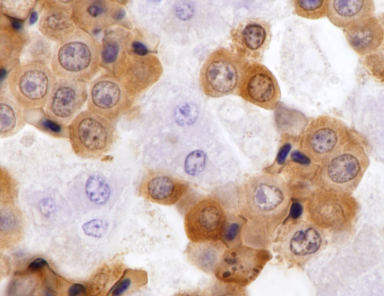Round hematopoietic tumor cells strongly infiltrated the hepatic blood vessels and sinusoids. The hepatic sinusoids were diffusely expanded by tumor cell infiltration, with fewer normal erythrocytes and enlarged Kupffer cells which sometimes contained cellular debris. Most hepatocytes were shrunken. A few granulocytes were also found in the hepatic sinusoid. Small foci of granulocytic cells at different nuclear maturation stages were present around some hepatic triads. Tumor cells appeared round, oval, or polygonal in shape with a distinct cell border, amphophilic cytoplasm, anisocytosis, and anisokaryosis. Some tumor cells contained perinuclear pale areas known as halos. The nucleus was round and hyperchromatic to pale, with one or two large nucleoli and coarsely clumped chromatin. Some binuclear tumor cells were also observed. There was significant mitosis and karyorrhexis of tumor cells. The cytoplasmic eosinophilic granules that are characteristic to myelocytic lineage cells were not present in tumor cells.Immunohistochemical analysis revealed that tumor cells consistently exhibited cytoplasmic staining of hemoglobin antigen, with variable staining intensity, faint to strong, depending on the tumor cell. Hemoglobin was also detected in normal erythrocytes. Tumor cells were negative for CD3 (T cell marker), BAFF-R (B cell marker), and Iba-1 (macrophage/monocyte marker). Enlarged Kupffer cells were positive for Iba-1.