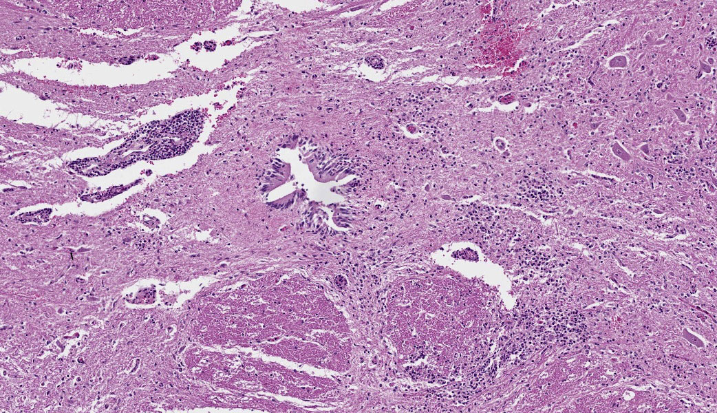 Brain, cerebellum and brainstem: In the brainstem gray matter, there are random multifocal, mild to moderate, variably discrete, infiltrates of hypersegmented and fragmented neutrophils, admixed with fewer mononuclear cells, consistent with microabscesses. Brainstem neurons within and adjacent to the neutrophilic infiltrates are pale, with central chromatolysis, consistent with neuronal degeneration. There are scattered microglial cells, mild gray matter spongiosis and infrequent microhemorrhages. Scattered blood vessels are lined by plump endothelial cells and have perivascular mild infiltrates of predominantly lymphocytes, with fewer neutrophils (perivascular cuffs). The cerebellar leptomeninges are multifocally, mildly infiltrated by predominantly lymphocytes, with fewer admixed neutrophils.