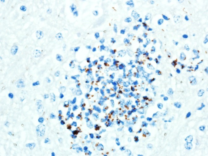 A replicate section was examined by immunohisto-chemistry using a rabbit polyclonal anti Listeria monocytogenes antibody (#DF2302-50-0, Fisher Scientific, Houston, TX, USA), at a dilution of 1:2000, using the Dako Envision system (Dako Agilent Pathology Solutions, Carpinteria, CA, USA), via an indirect immunoperoxidase procedure. Within the microabscesses in the brain and cervical spinal cord, there were a low to moderate number of bacteria that bound to the primary antibody.