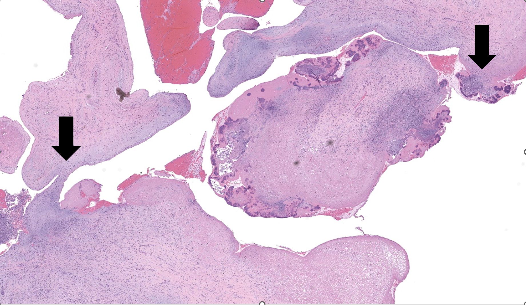 Endocarditis refers to the inflammation of the endocardium, primarily of the heart valves, and can affect most animal species.7 Mechanistically, endothelial lesions tend to start at areas of highest trauma, particularly the lines of apposition of the valvular surface exposed towards the direction of blood flow.2,5 Bloodborne microorganisms may become adhered to these regions, resulting in a localized infection, which can cause valvular injury and subsequent insufficiency.2,5 Infectious causes are usually of bacterial origin, usually from systemic infection, but can also be of mycotic or parasitic origin.5 The bacteria most commonly involved in valvular endocarditis varies among species, but Streptococcus sp., Staphylococcus sp., and Enterococcus sp. have been implicated in endocarditis in humans and most animal species.5 In cattle, Trueperella pyogenes is the most common agent involved in bacterial endocarditis, whereas in pigs, Erysipelothrix rhusiopathiae is most common. Bacterial endocarditis is less common in horses, dogs, and cats.5Valvular endocarditis usually involves the left atrioventricular valve, followed by the aortic valve, right atrioventricular valve, and pulmonic valve.5 In non-human primates, valvular endocarditis is an uncommon spontaneous finding, with an incidence of 0.6% of all spontaneous cardiovascular lesions observed.1 Endocarditis can be associated with systemic bacterial infections or, particularly in the laboratory environment, contaminated venous indwelling catheters, the latter more commonly affecting the right atrioventricular valve.6 Interestingly, in cattle, the right atrioventricular valve is mostly affected, most likely due to the increased incidence of liver abscesses and subsequent bacterial venous spread to the caudal vena cava and right side of the heart.4
