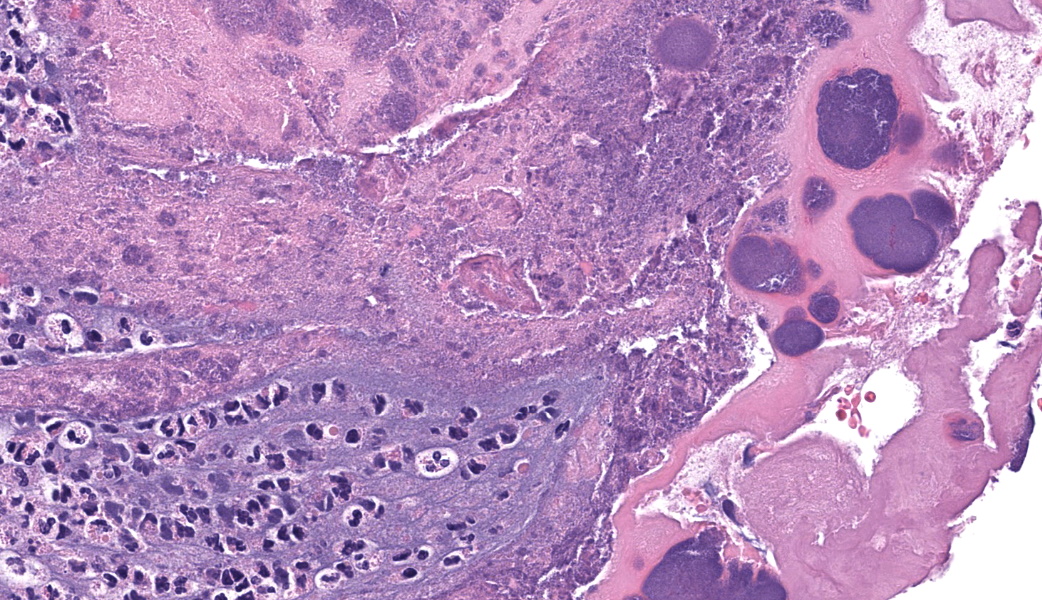 Representative sections of heart and lungs are examined.In the heart, the right atrioventricular valve is extensively overlain by large mats of fibrin, admixed with numerous degenerate and viable neutrophils and multiple coccobacilli bacterial colonies. The valvular stroma is diffusely expanded by moderate myxedema and there are moderate numbers of neutrophils and lesser numbers of hemosiderin-laden macrophages, plasma cells and lymphocytes scattered throughout the valvular stroma and expanding the endocardium of the adjacent papillary muscles. The epicardium and surrounding adipose tissue are mildly infiltrated by small numbers of neutrophils, lymphocytes, and plasma cells.