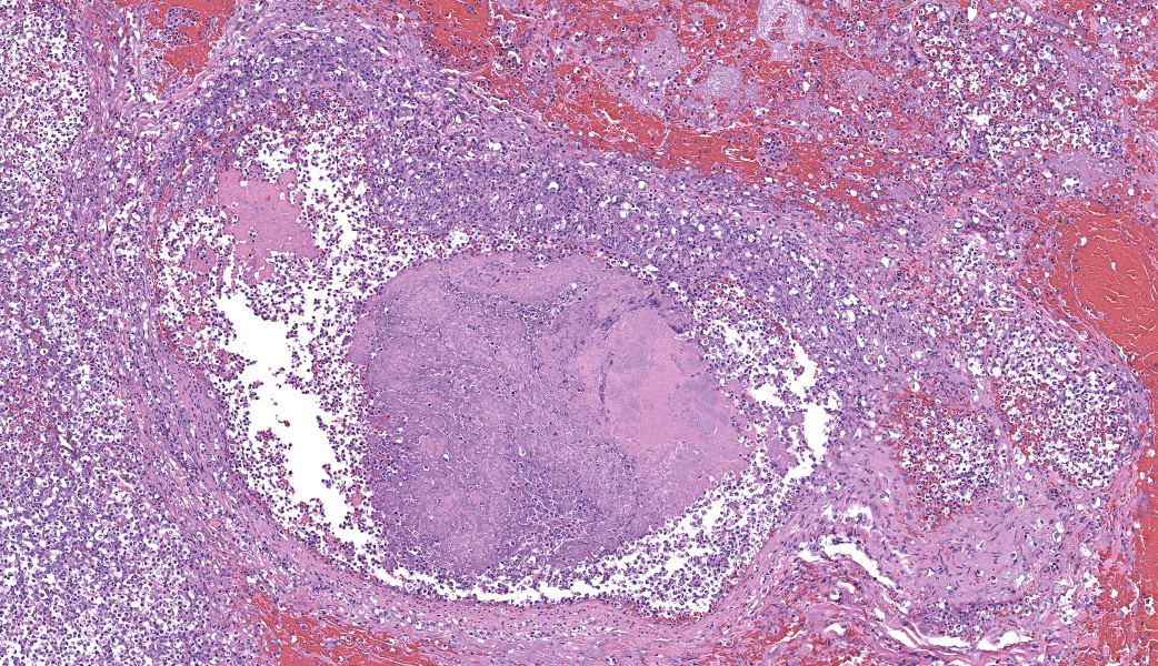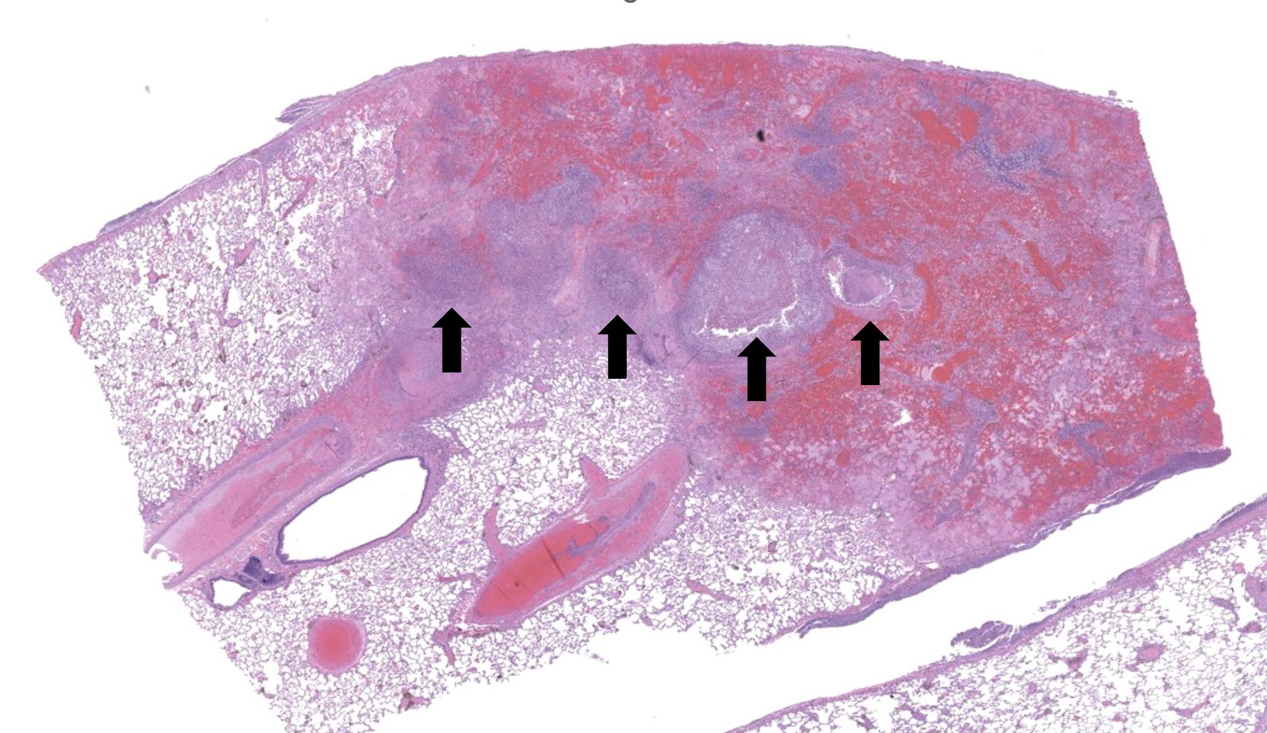 Regionally, sharply demarcated areas of the pulmonary parenchyma are markedly necrotic and replaced by abundant hemorrhage, fibrin, inflammatory infiltrates composed mainly of neutrophils and macrophages, and necrotic cellular debris. In these areas, multiple blood vessels contain thrombi consisting of large numbers of degenerate neutrophils, organizing fibrin, occasional colonies of bacterial coccobacilli, and necrotic cellular debris that variably obscure the lumen and vessel walls. Affected vessels often have smudgy, hypereosinophilic walls that are transmurally infiltrated by neutrophils, lymphocytes, and macrophages. In less affected regions, the alveolar spaces contain a small amount of fibrin, numerous foamy alveolar macrophages (some of which contain brown granular hemosiderin pigment), and fewer neutrophils and erythrocytes. There are moderate numbers of hemosiderin-laden macrophages mostly concentrated around pulmonary arteries, multifocally. Regionally, along the pleural surface there is a large amount of fibrin admixed with numerous degenerate neutrophils and necrotic cellular debris. The pleura itself is mildly thickened by fibrous connective tissue and edema and is multifocally lined by markedly reactive mesothelium, characterized by plump, rounded mesothelial cells.
