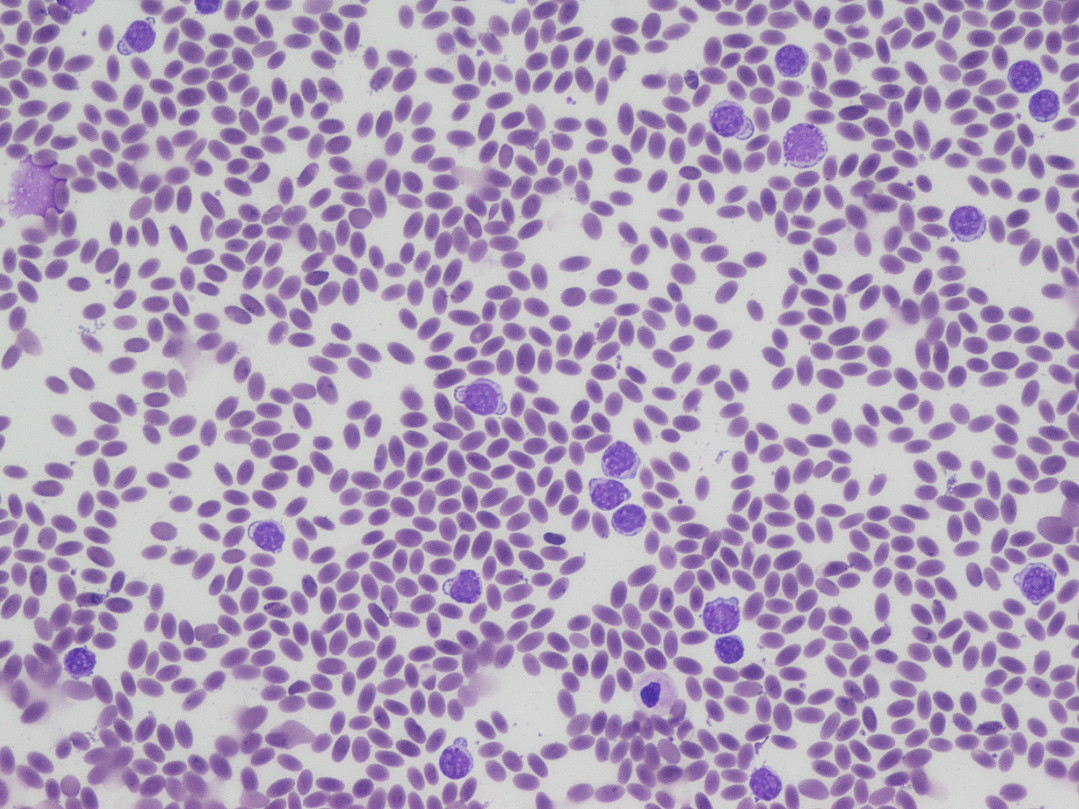 HematologyOn the blood smear collected during the initial clinical exam, numerous large atypical lymphocytes were observed throughout the smear.