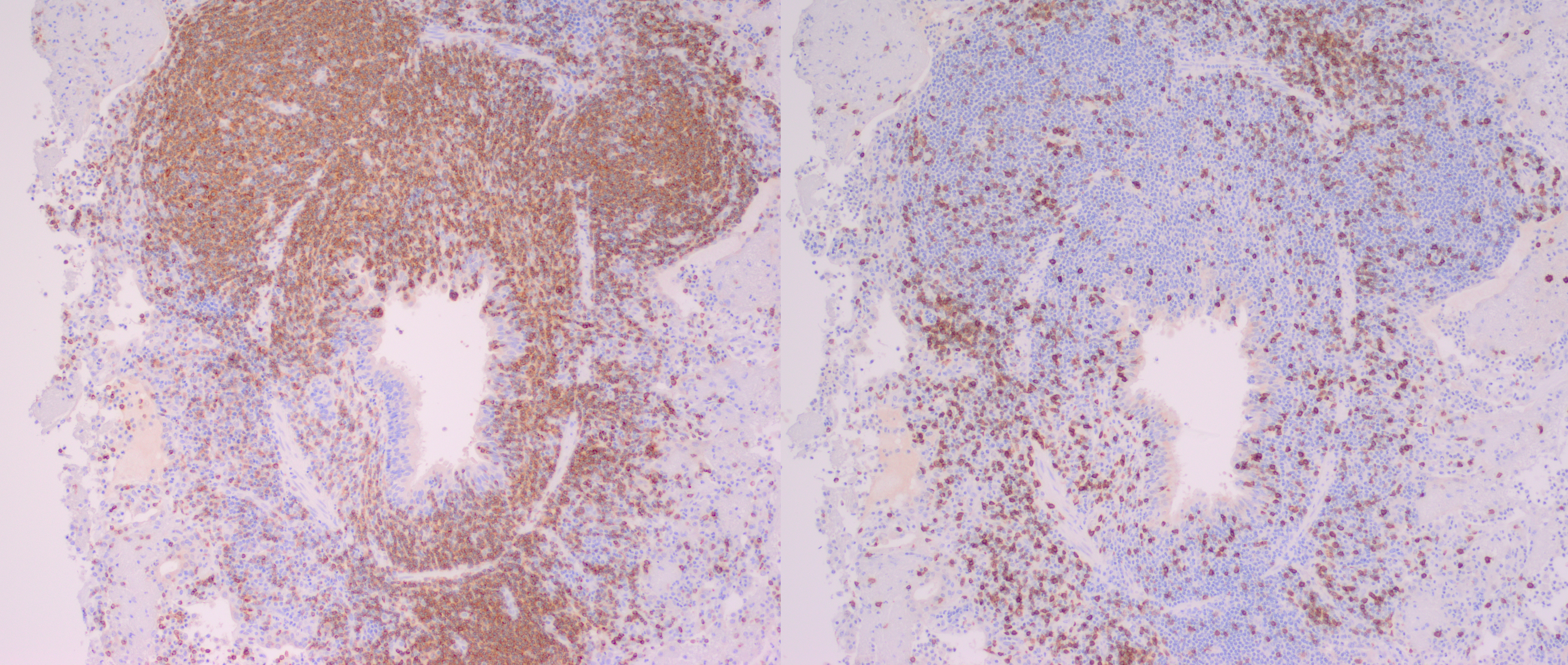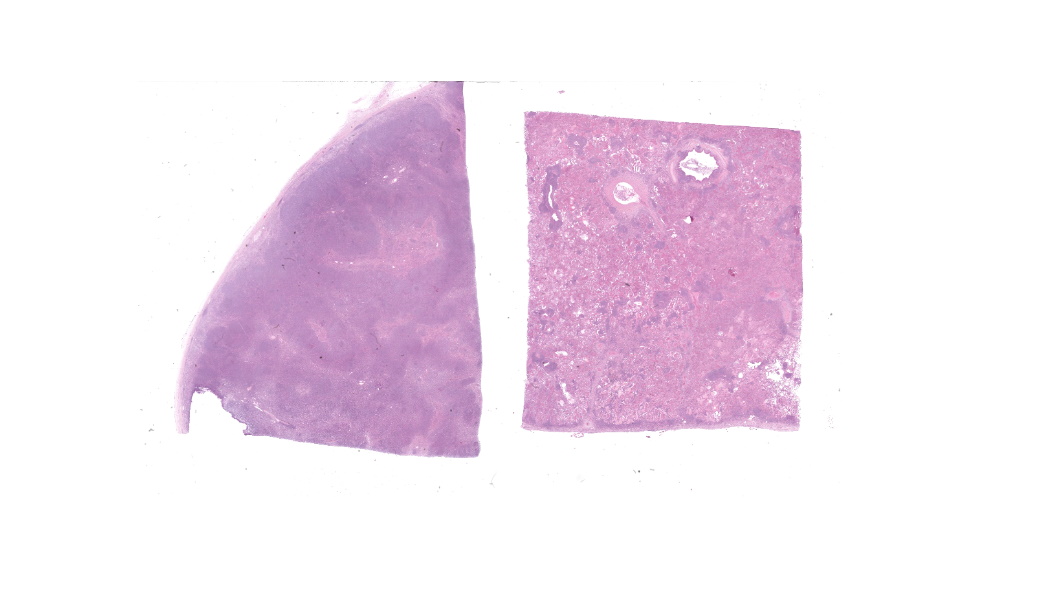 Lung and Lymph node; B-cell lymphomaLung; bronchopneumonia, fibrinosuppurative, multifocal, severe, subacute, with type II pneumocyte hyperplasia.