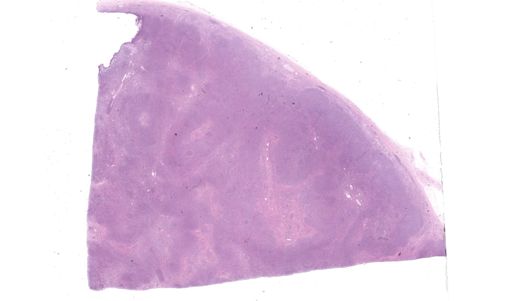 Camel; Paratracheal Lymph NodeDescription Multifocally the normal architecture of the cortex, paracortex and medulla is disrupted and replaced by a densely cellular neoplasm composed of lymphoid cells. The neoplasm is comprised of sheets of closely packed small round cells with nuclei 5-7µm in diameter. Cells are mostly round with indistinct cytoplasmic margins, scant basophilic or eosinophilic cytoplasm, high nuclear to cytoplasmic ratio, and a paracentric nucleus with coarsely clumped chromatin. There is mild anisocytosis and anisokaryosis. There is an average of 12 mitoses per 2.37mm2. Within the capsule of the lymph node there are small aggregates of neoplastic cells organized into sheets.