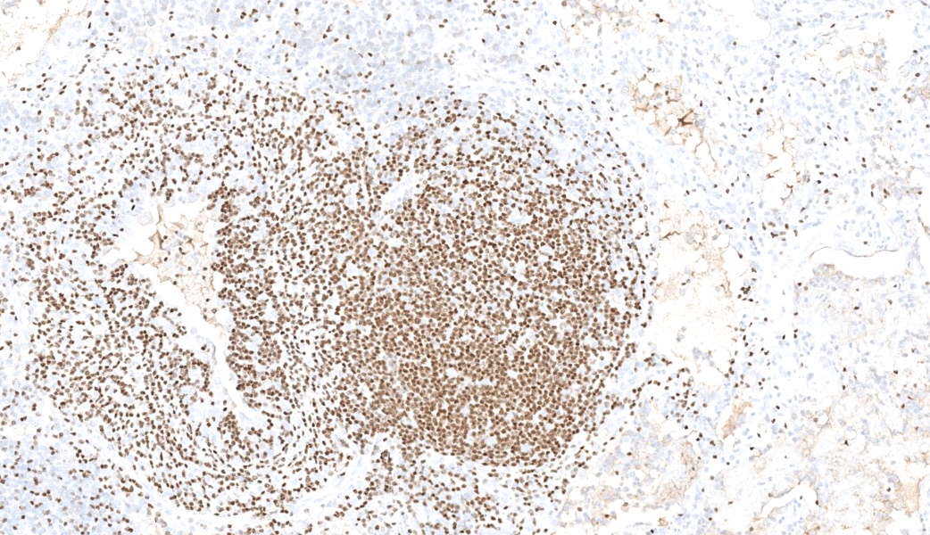 Moderate numbers multifocally throughout the medulla |