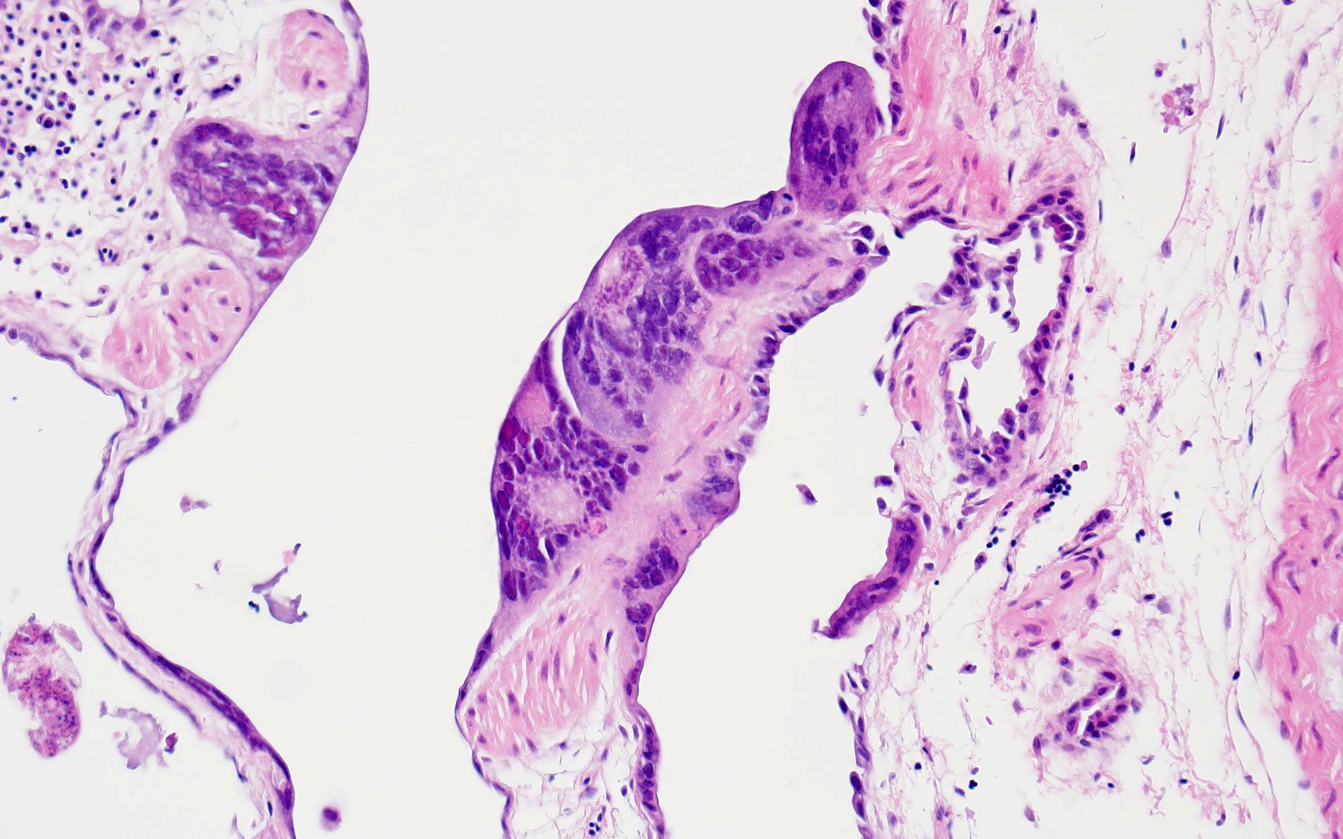 In addition to the respiratory epithelium, a tubular structure adjacent to the ovary was also affected by PsAHV-5 (i.e., had syncytia and epithelial necrosis). The smooth muscle wall and cellularity of this structure is consistent with either oviduct or remnant Wolffian duct. This suggests that PsAHV-5 may have a broader epitheliotropism beyond respiratory epithelium.