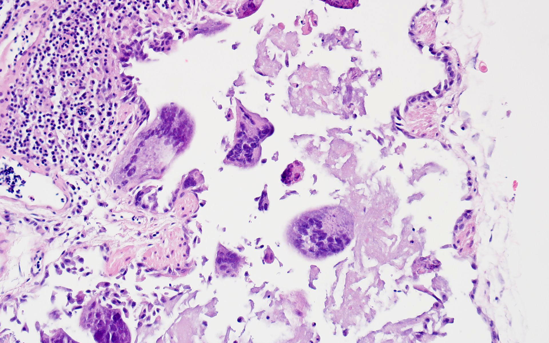 - Tubular reproductive tract, air sac, lung: Epithelial necrosis, acute, multifocal, moderate, with intranuclear viral inclusions and numerous syncytia.