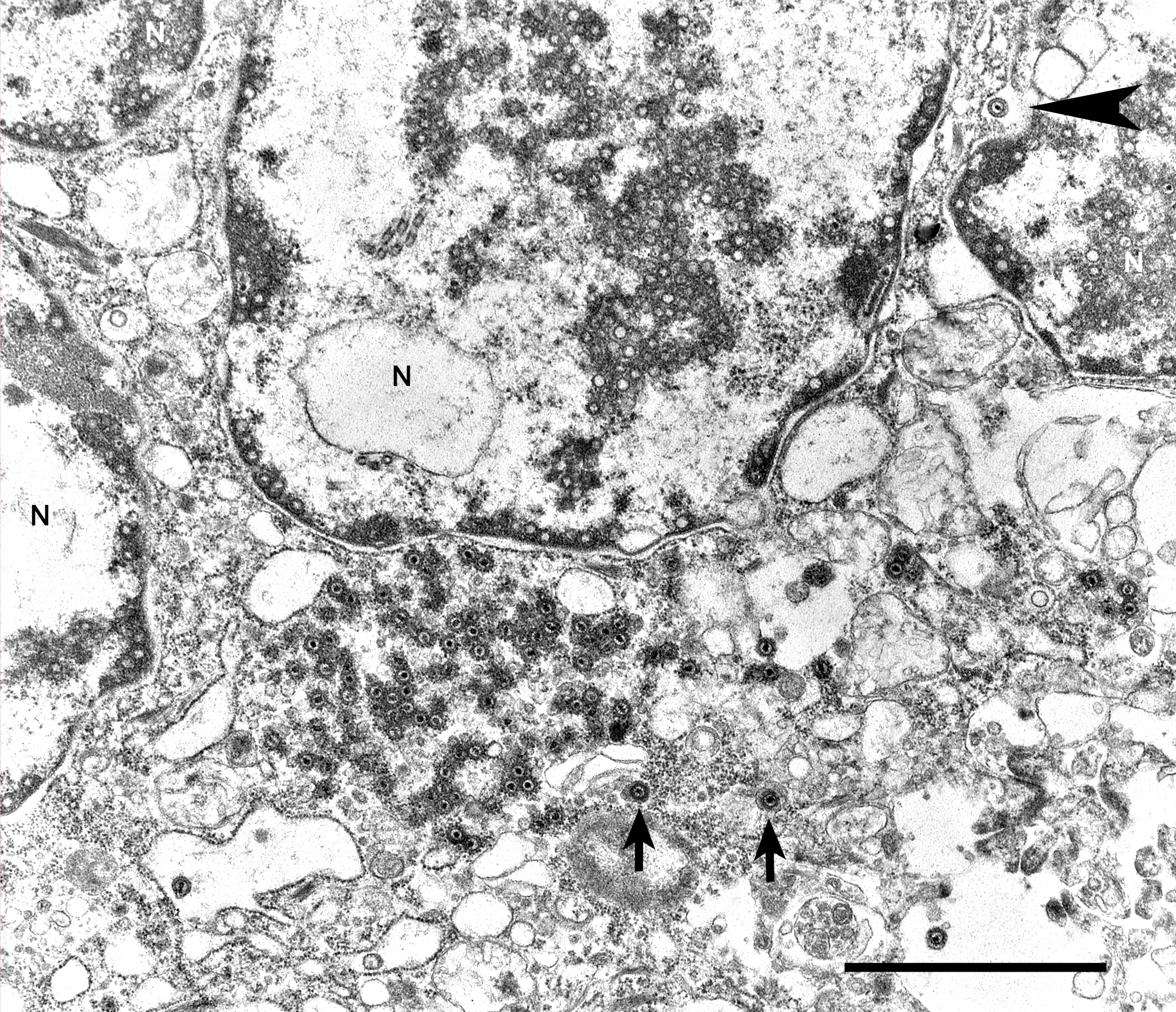 Transmission electron microscopy - lung: Intranuclear and intracytoplasmic herpesviral replication complexes