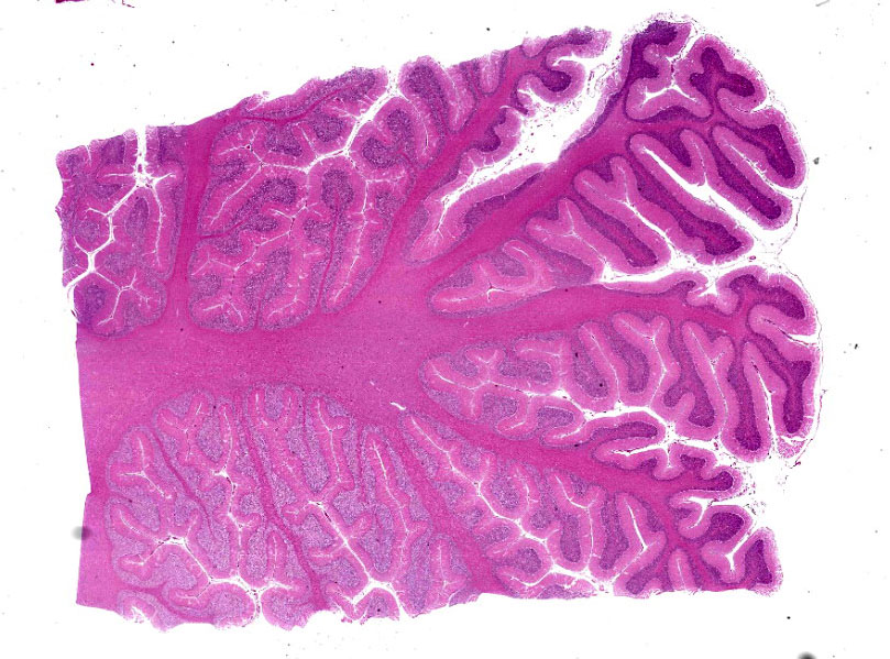 Cerebellum: Neuronal vacuolation and loss, diffuse, severe with occasional neuronal intracellular granular eosinophilic material ac-cumulation, torpedoes, spheroids and digestion chambers (Wallerian degeneration).