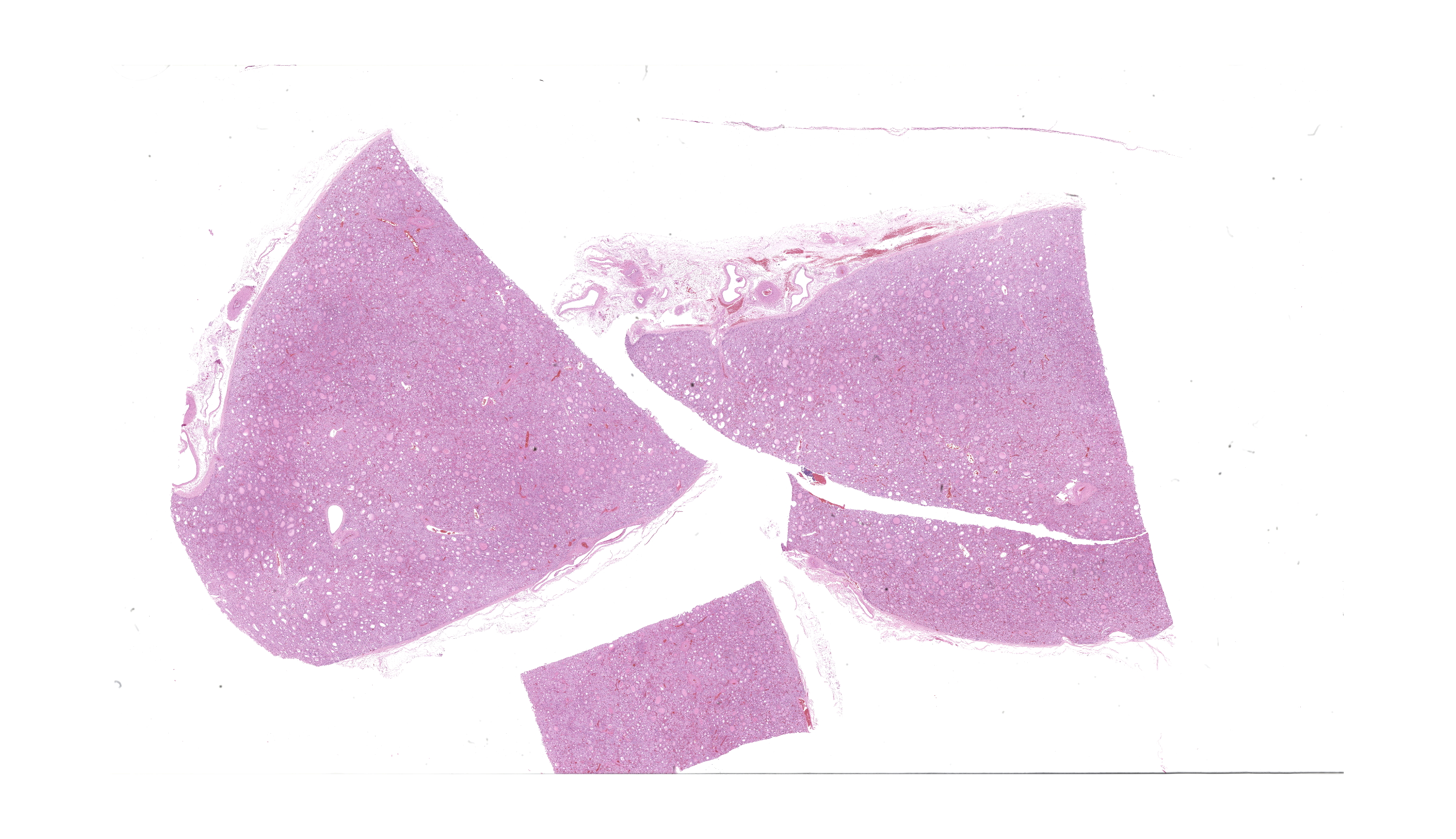 This foal has the macroscopic and microscopic changes of the syndrome of horses known as thyroid hyperplasia and musculoskeletal deformities (TH-MSD) or congenital hypothyroidism-dysmaturity syndrome. Foals with or without musculoskeletal deformities may have microscopic thyroid hyperplasia yet no clinically visible goiter. A variety of musculoskeletal deformities occur.Affected horses are newborn or are aborted. Foals have microscopic hyperplasia of the thyroid gland and may have multiple congenital musculoskeletal deformities. The thyroid gland are usually of normal size macroscopically.
