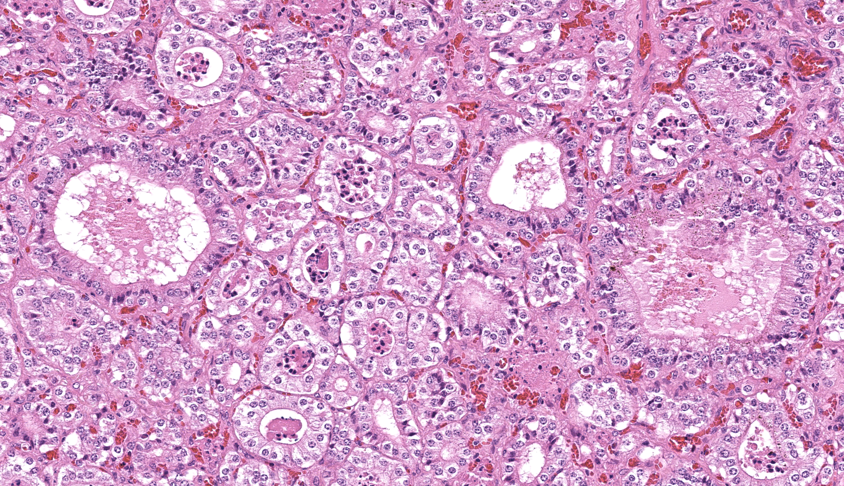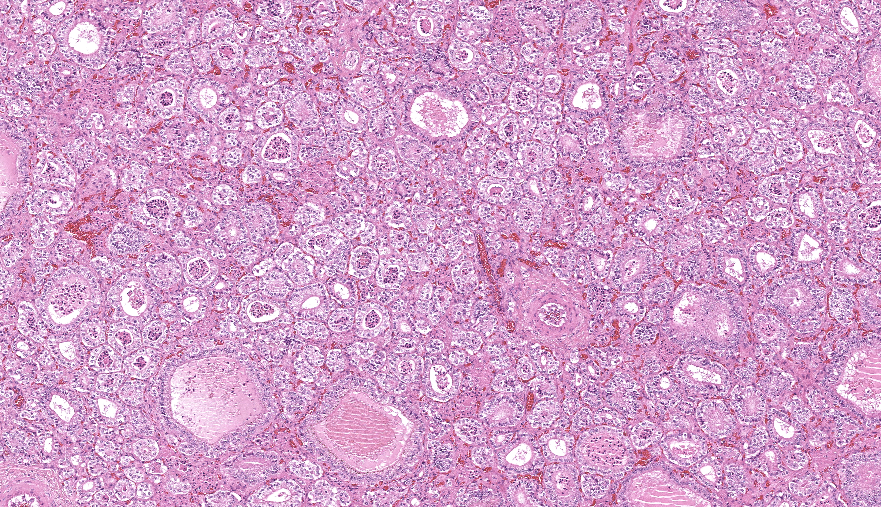 About 20% of follicles have colloid in the lumen and even those had a small diameter. The majority of follicles have no colloid or lumens. The thyroid follicular cells are tall cuboidal to columnar with abundant cytoplasm. Thyroid medullary cells are inapparent.Contributor's Morphologic Diagnoses: