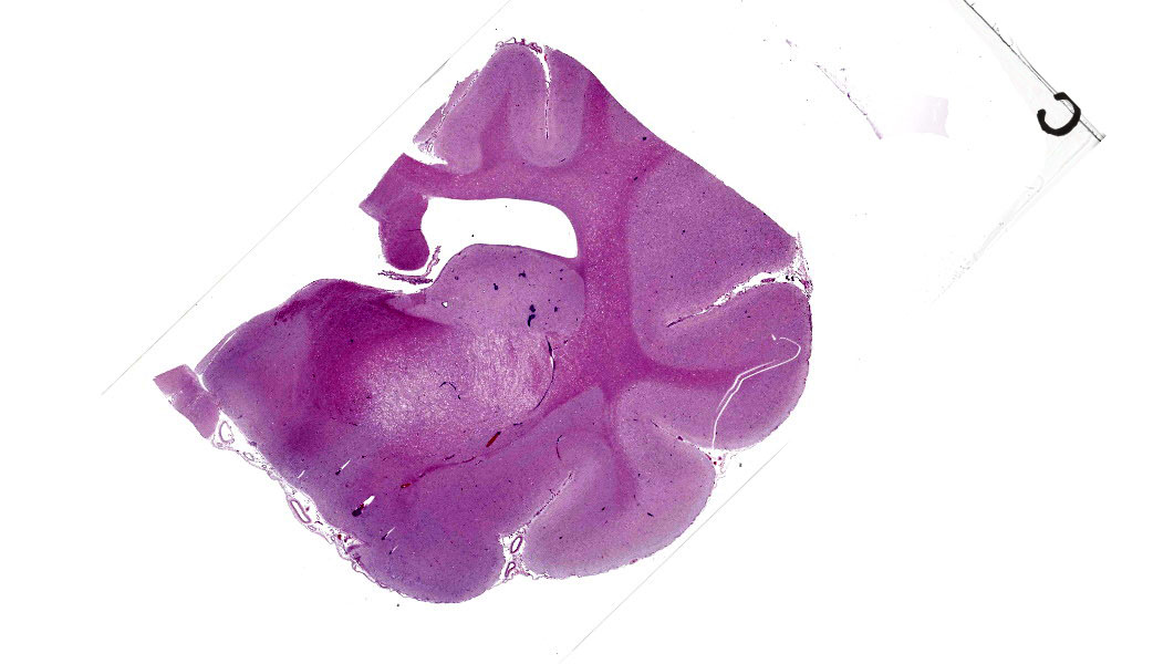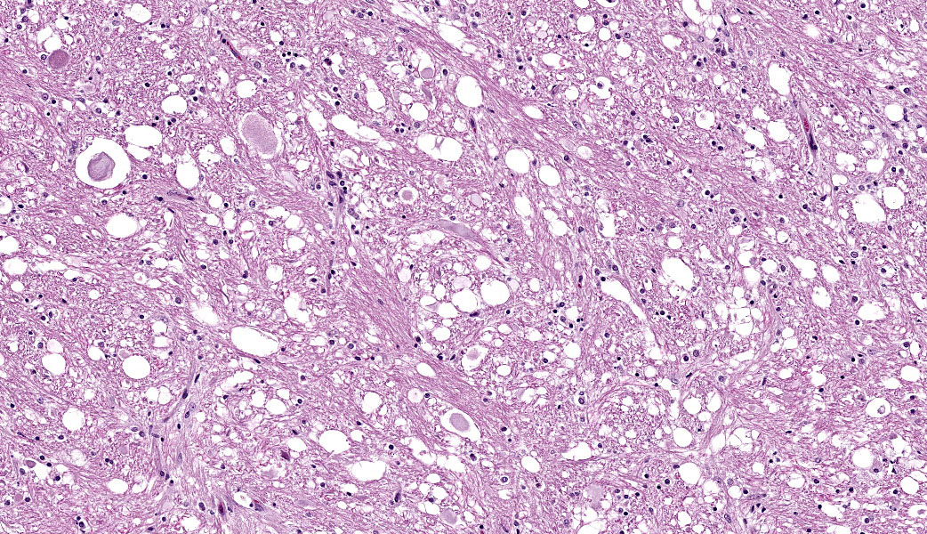 The slide contains one section of cerebrum at the level of the basal nuclei and corpus callosum. The white matter and, to a lesser extent, grey matter are moderately vacuolated and hypercellular. Vacuolation is defined by clear, well-demarcated vacuoles that reach up to 50 um diameter (spongiosis). The neuropil is additionally disrupted by increased numbers of proliferating glial cells (gliosis). Parenchymal vacuolation and gliosis of the grey matter is less severe than that described within the white matter. Neurons and astrocytes occasionally contain round intranuclear inclusion bodies that are approximately 5 um diameter and brightly eosinophilic. Morphologically-similar, intracytoplasmic inclusions are rare. Perivascular cuffing throughout the grey and white matter is characterized by mild to marked expansion of Virchow-Robbins space by small numbers of densely-packed lymphocytes and fewer plasma cells.
