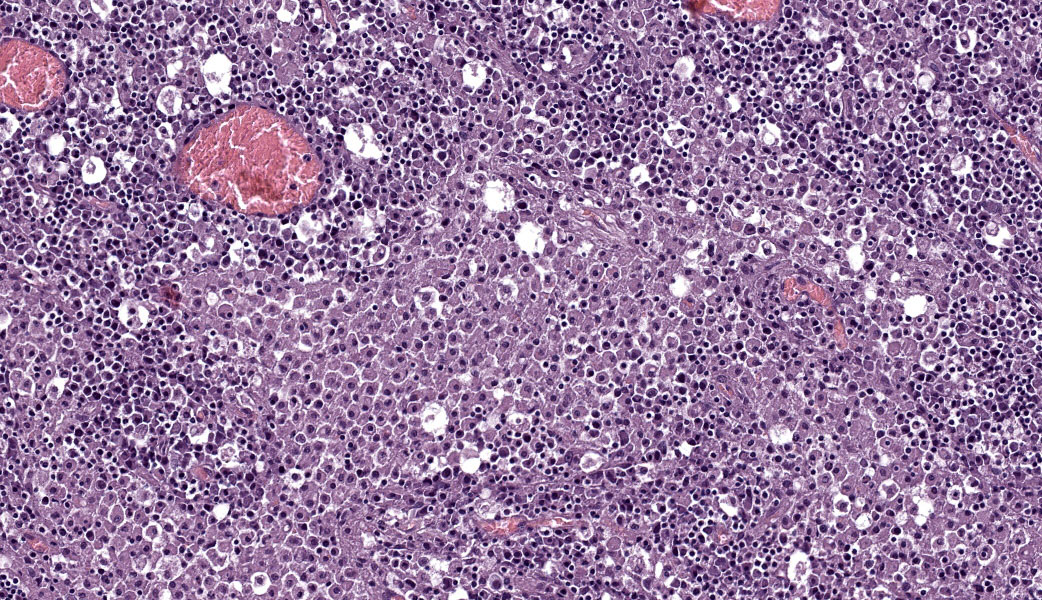 Wrapping up this conference was a stunning case of canine morbillivirus with readily identifiable viral inclusions. Canine distemper virus is a top infectious cause of demyelinating injury in dogs. This is due to direct infection and destruction of glial cells, such as oligodendrocytes (primary myelinating cell of the CNS), astrocytes, and microglia.3,5 CDV can also infect neurons, including Purkinje's cells and granular cells.3 The cerebellum is consistently affected in cases of CDV, with demyelinating lesions in the cerebellar white matter. Other common sites for similar lesions include the periventricular white matter (especially around the 4th ventricle) and the optic pathways.3 Occasionally, the white matter of the spinal cord may be involved. The Pesavento Lab also performed IHC on this case and was able to readily demonstrate the virus within glial cells and neurons in this case.