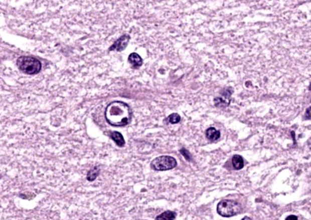 This case highlights an excellent example of canine distemper virus infection in the brain of a dog. Astrocytes and neurons contain both intracytoplasmic and intranuclear viral inclusion bodies, which are characteristic of Canine Distemper Virus (CDV) and other Paramyxoviruses including Newcastle Disease Virus, Measles Virus and Rinderpest Virus. The first supplementary image illustrates immunoreactivity for CDV within a neuron. The second supplementary image highlights demyelination and status spongiosis of the white matter, which has been proposed to be consequent to the direct effect of the virus on oligodendrocytes. Interestingly, there is no ultrastructural evidence of viral infection of oligodendrocytes.5 However, studies over the past decade have suggested that an axonopathy precedes demyelination, therefore promoting speculation that CDV encephalopathy is not a primary demyelinating disease.4