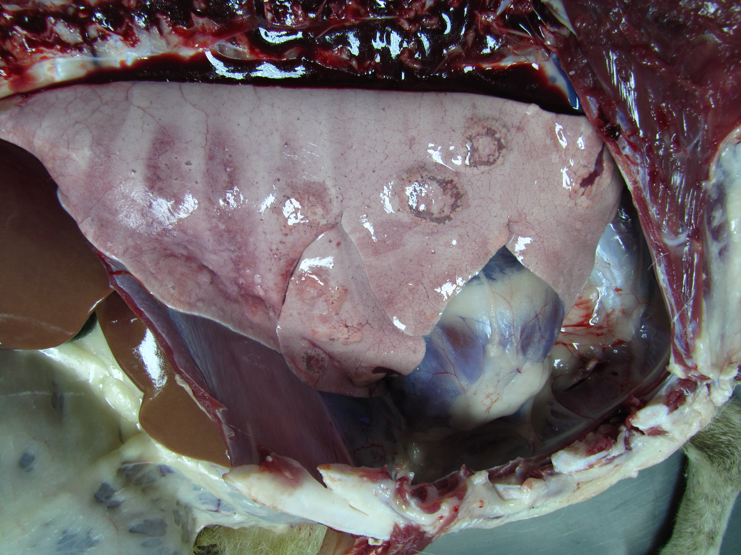 In the lung, there were several soft, yellowish subpleural nodules of variable sizes (0.5-2cm) and surrounded by a red rim.