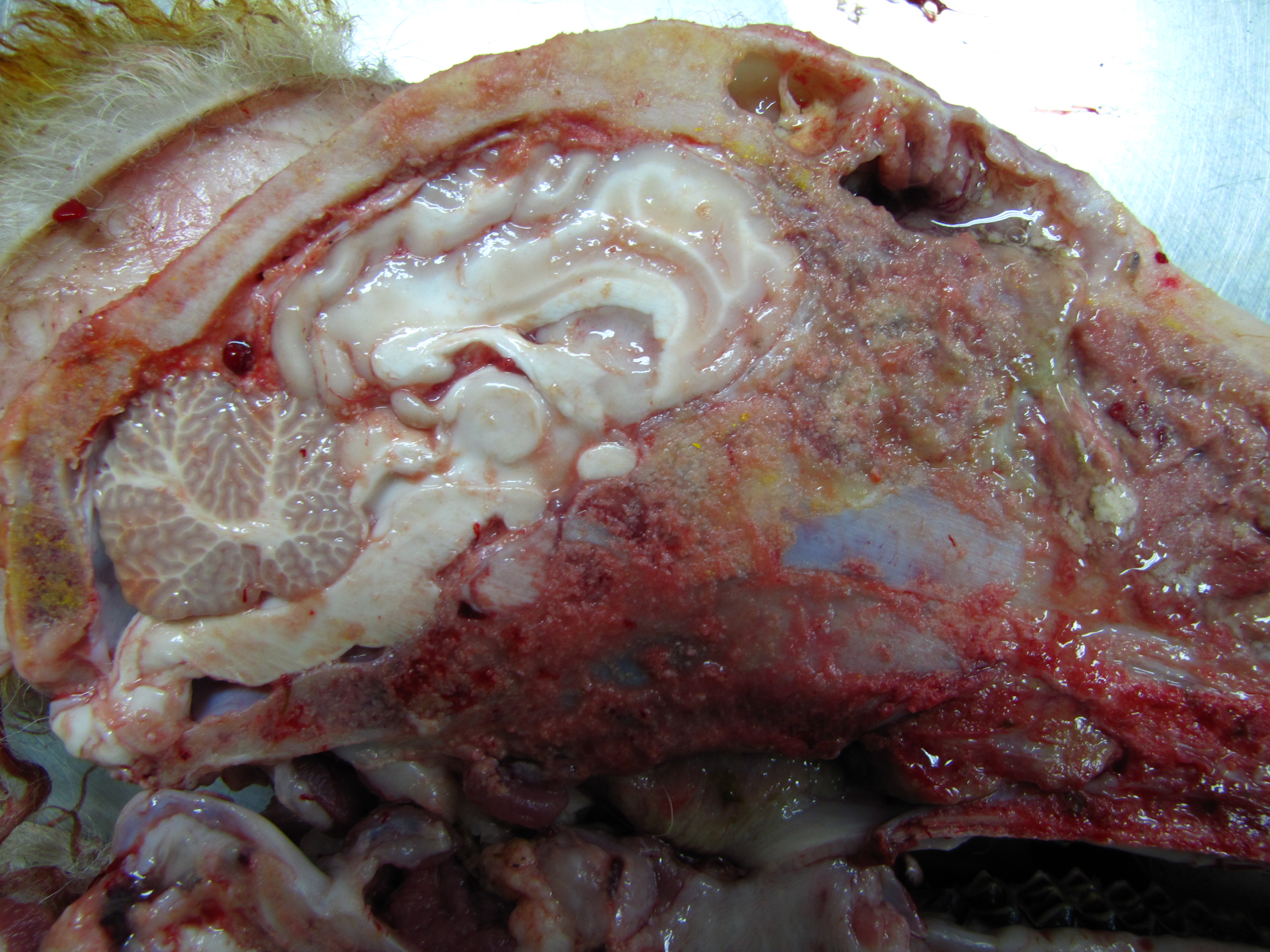 On July 24, 2018, the ewe presented with a mild nasal mucohemorrhagic discharge. When rechecked on July 28, 2018 the discharge had become more severe and the ewe was dyspneic and gasping. There was cranium facial asymmetry of the right eye due to exophthalmos. The protrusion of the eyeball resulted in keratitis and corneal ulceration. The ewe was treated with homeopathy with no success. Due to poor prognosis, the ewe was euthanized 34 days after the onset of clinical signs. During July-August, 2018, two more cases of the same disease occurred on the premises.Gross Pathology: