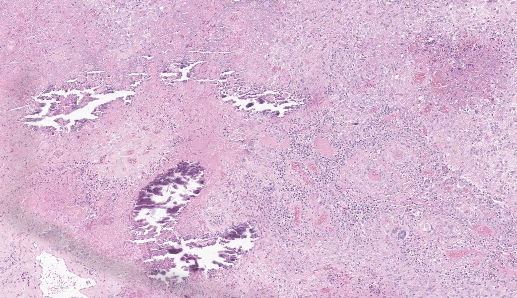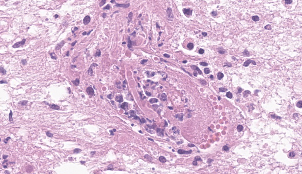 - Cerebrum: Meningoencephalitis, pyogranulomatous and necrotizing, chronic, focally extensive, severe, with vasculitis, thrombosis, and numerous intravascular and intrahistiocytic fungal hyphae.