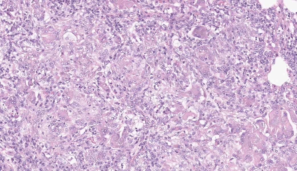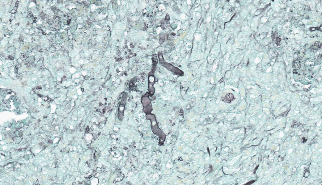 Discussion focused on indicative features of a zygomycete histologically, which include a broad diameter ranging from 5-15um, non-parallel thin walls, rare septations, asymmetric acute-angle branching, and potentially a terminal bulb. Zygomycetes are typically weakly PAS-positive and more strongly GMS-positive. This correlated nicely with the PAS and GMS stains run in-house. Other differentials mirrored those discussed by the contributor, including oomycetes like Pythium insidiosum, which would be PAS-negative and GMS-positive, as well as Basidiobolus spp., another member of the Entomophthoramycota family alongside Conidiobolus. However, Basidiobolus spp. typically affect the thorax, trunk, limbs, intestinal tract, and, in atypical cases, can cause systemic infection.28Conidiobolus is far more commonly seen localized to face and nostrils. Using a variety of proteases (including elastase and collagenase), lipases, esterases, and glycoside hydrolases at their disposal, Conidiobolus spp. can wreak havoc to the nasal and facial bones and surrounding soft tissues24. Ultimately, they may eat through the cribriform plate and enter the brain.28,29 It’s pretty much “game over” at that point.