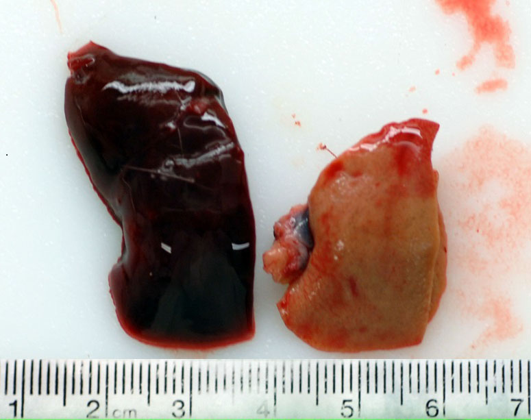 This rat has a body score of 3/5 with adequate subcutaneous and visceral fat. The skin incisions over the skull and left thorax from the telemetry surgery have completely healed. The pocket over the left thorax holding the telemetry device contains 5 ml of milky serosanguinous fluid. There is a layer of fibrin coating the telemetry device. The lungs were collapsed and diffusely red. The spleen is enlarged measuring 6.5 x 2 x 1 cm, friable with a homogenous pale red area on one pole (infarct). The liver is diffusely pale (light brown) and friable and the thymus is mottled tan/brown. The pancreas is soft and tan and both kidneys have a brown/green appearance. There is a moderate amount of dry food contents in the stomach, small amount of normal digesta and gas in the small intestine, moderate amount of soft green contents in the cecum and many dry fecal pellets in the colon. There is no urine in the bladder.