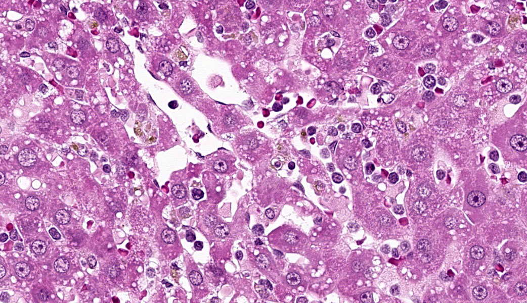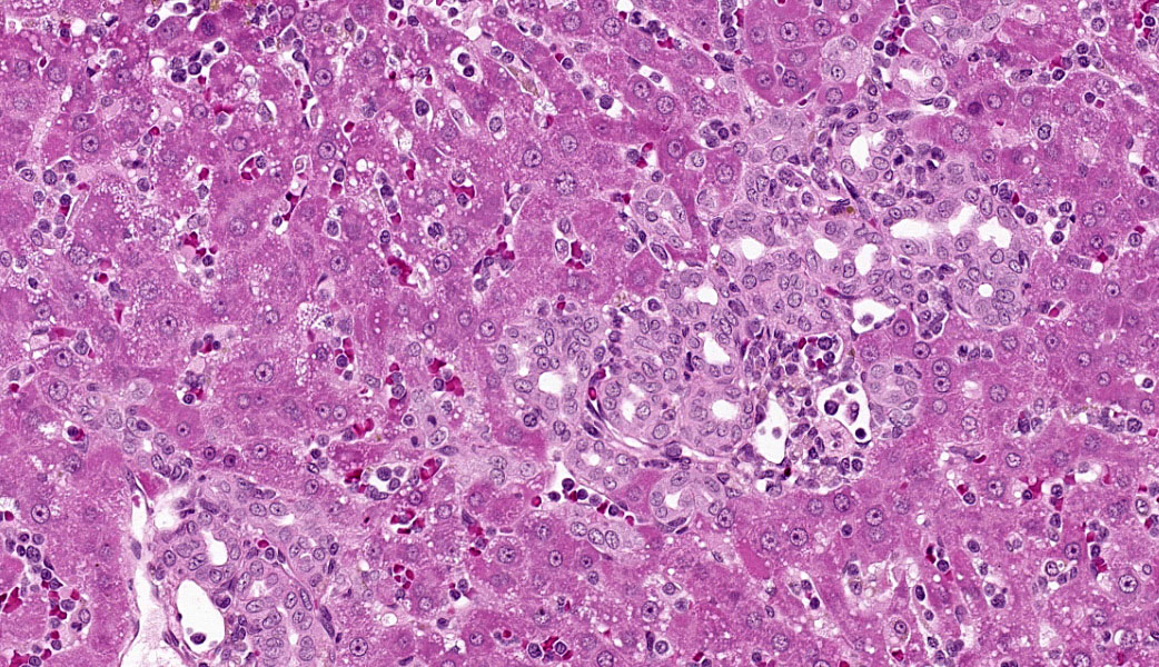Diffusely centrilobular hepatocytes are lost, degenerating or necrotic. Diffusely there is lobular atrophy and sinusoids are expanded by previously described neoplastic cells admixed with eosinophilic cellular debris. Multifocally centrilobular kupffer cells and/or hepatocytes contain hemosiderin pigment. Multifocally within portal regions there is an increase in small bile duct profiles (ductular reaction). Rarely, bile duct epithelial cells are degenerative, necrotic or undergoing regeneration.