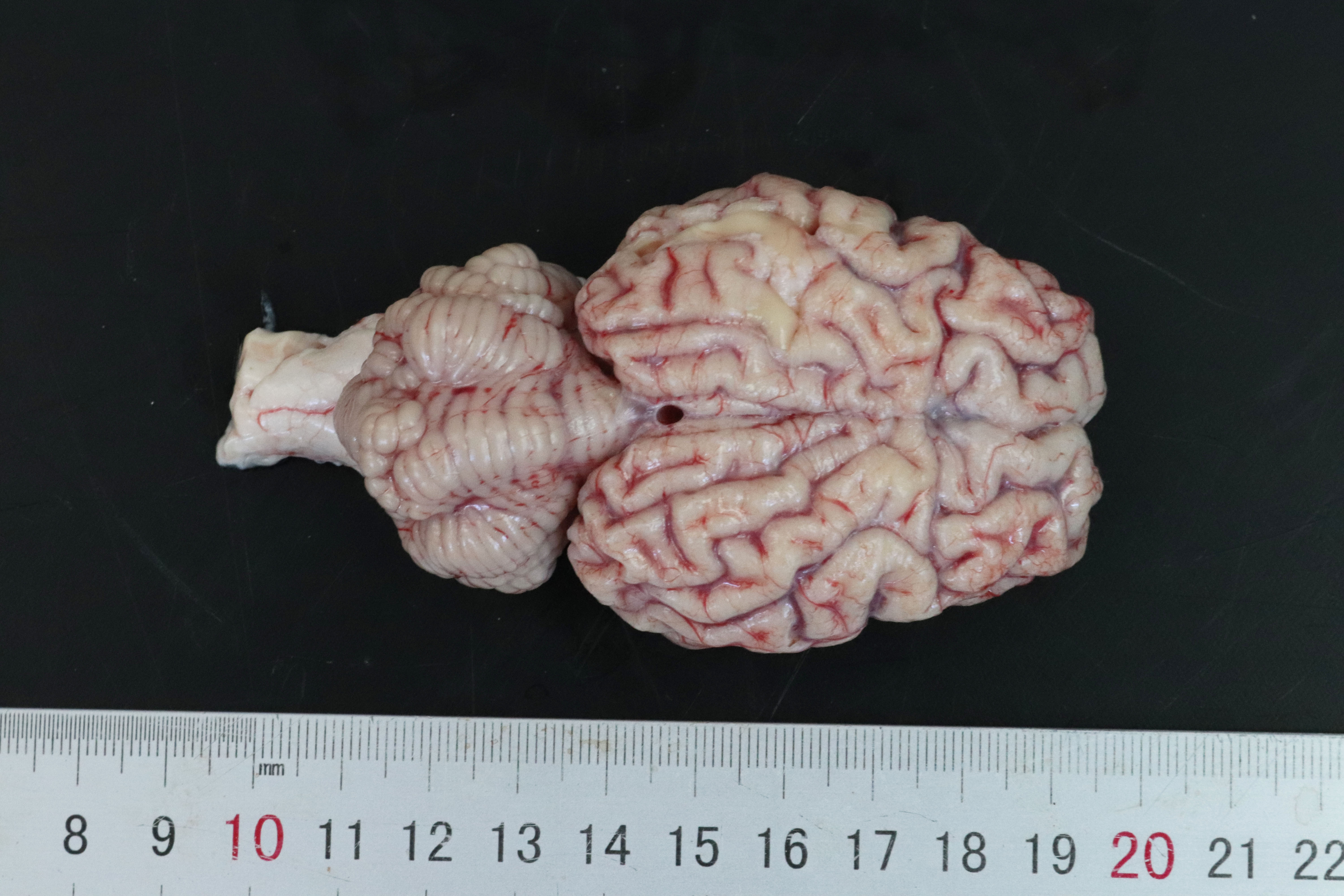At postmortem examination the cerebral hemispheres were small, firm and flattened dorsoventrally. The sulci were wider, gyri were narrower than normal. There was diffuse, mild to moderate yellow discoloration.Laboratory Results:
