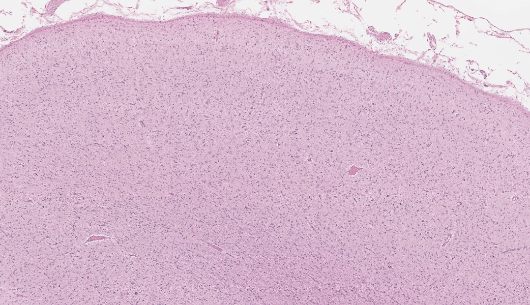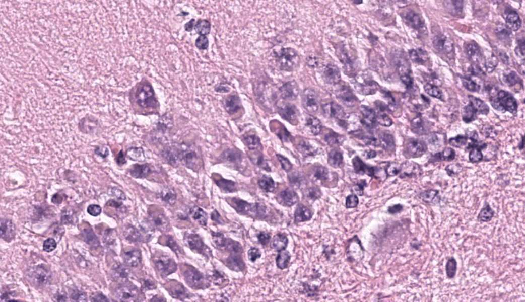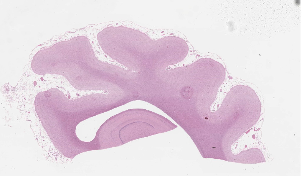 This classic case of ovine neuronal ceroid lipofuscinosis (NCL) stimulated great discussion on some of the histologic changes seen in the conference slide. It was the opinion of conference participants that there was true ventricular dilation evident histologically, likely secondary to the cerebral atrophy and parenchymal loss that is characteristic in this condition, leading to the development of a hydrocephalus ex vacuo. This brand of hydrocephalus is characterized by the ventricles filling with additional cerebrospinal fluid (CSF) in response to a vacuum created by the extra space from parenchymal loss. As the pathogenesis would imply, there is no accompanying increase in CSF pressure with this type of hydrocephalus as there is in other types.One participant remarked that there was an increased number of visible axons within the affected grey matter. This posed the question of whether the increased visibility of axons was secondary to the neuronal loss from NCL or if there was true disorganization of the axons from the outset. The jury was split on this one, but the majority thought it was likely due to the former. A discussion on the intracytoplasmic storage material within neurons in this condition followed, including a review of the difference between lipofuscin and ceroid. Lipofuscin is considered a normal “wear and tear” pigment seen in long-lived cells and is not considered to be related to pathologic processes. Ceroid, however, is only seen in disease states and accumulates secondary to oxidative stress. The autofluorescent proteins in these cases are stored within lysosomes, which are unable to further break them down due to an endo-lysosome defect. In this case, in-house Luxol fast blue and PAS stains were performed, which nicely highlighted the intracytoplasmic accumulations.
