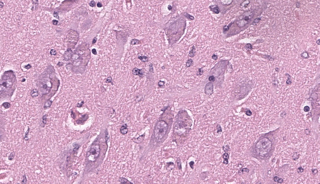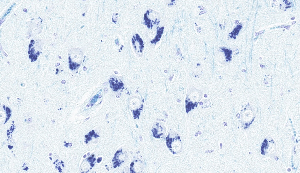 Brain, frontal cortex: There is diffuse disruption of the laminar cortical architecture and diffuse atrophy of all layers, most apparent in the granular, pyramidal and ganglionic cell layers (mid-layers atrophy). The grey matter shows neuronal loss and diffuse moderate gliosis with increased numbers of astrocytes. The remaining neurons frequently contain variable numbers of up to 5 µm diameter, granular to globular, glassy, eosinophilic, intraneuronal bodies displacing large and often vesicular nuclei. Small neurons show hypereosinophilic cytoplasmic and pyknotic nuclei (necrosis).Luxol fast blue (LFB): Intraneuronal storage material is LFB positive.