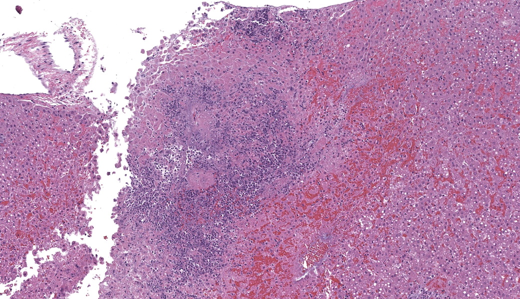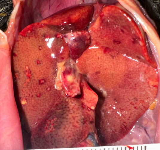 - Liver: Severe, acute, multifocal, necrotizing and suppurative cholangiohepatitis with multifocal hemorrhages, acute random hepatic necrosis, and intralesional bacilli
