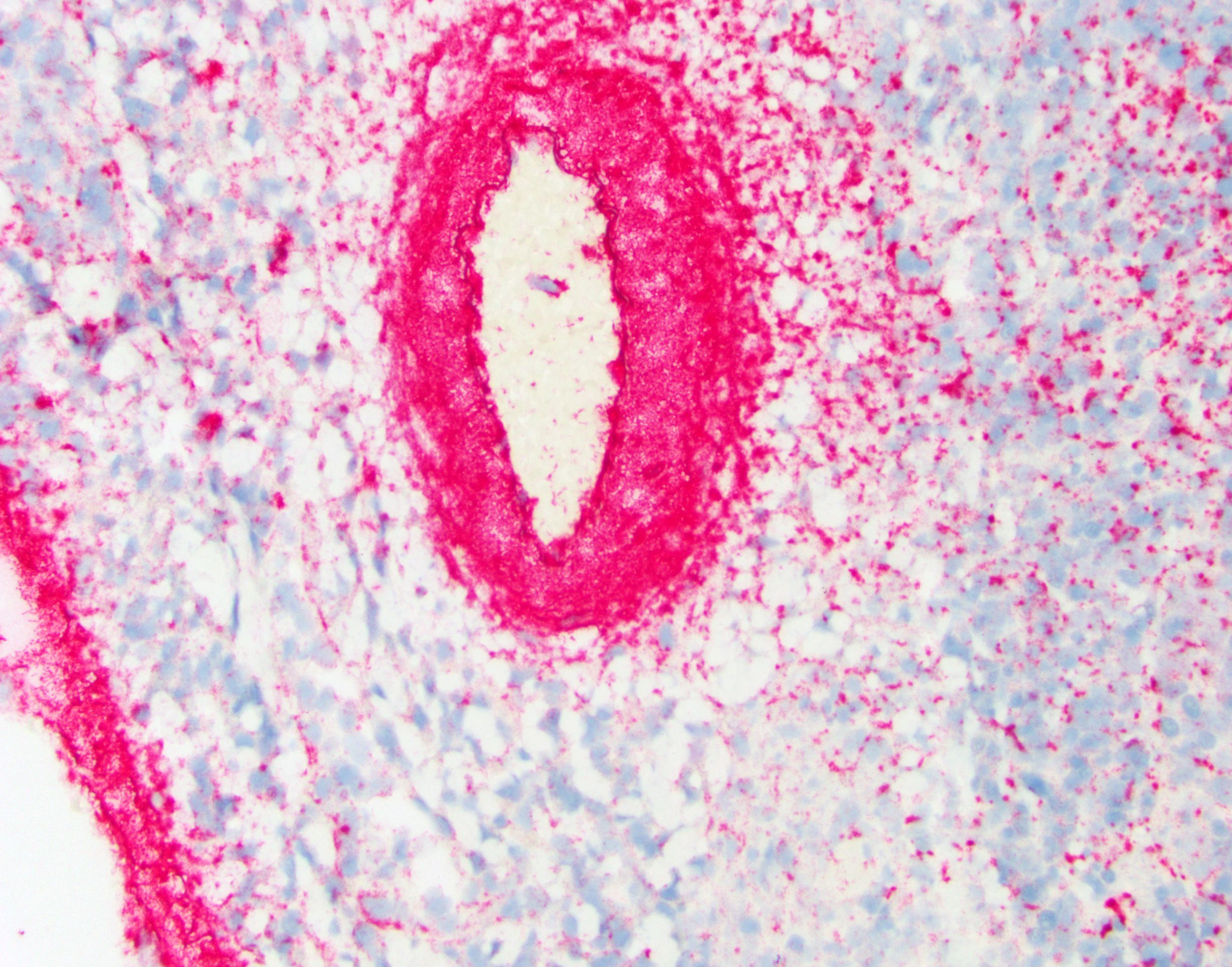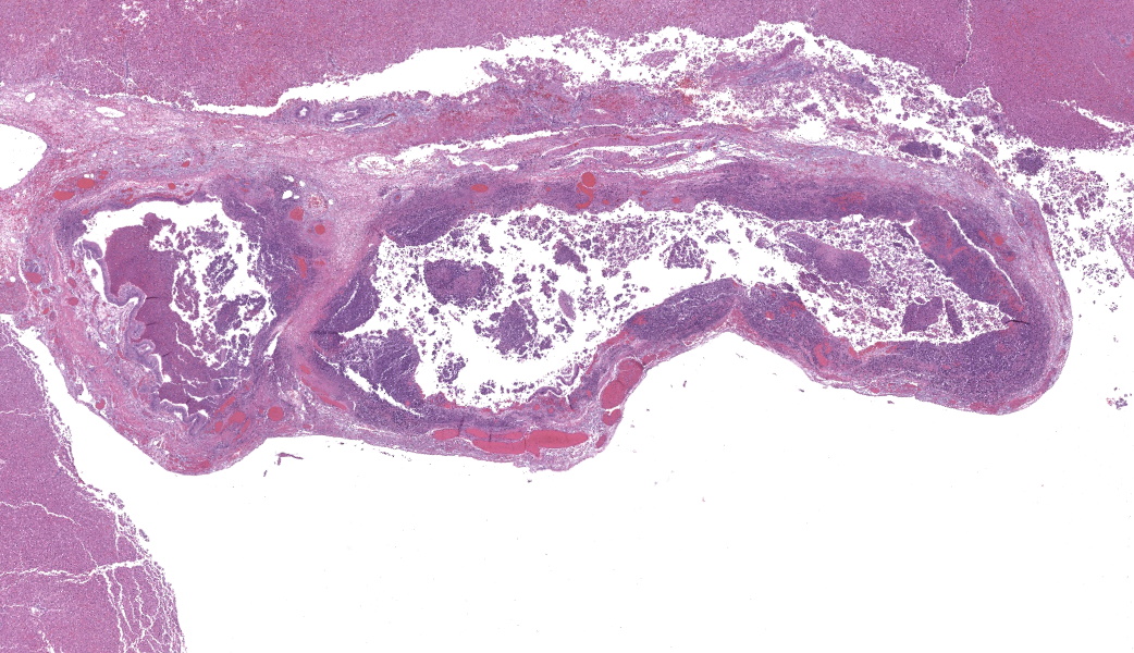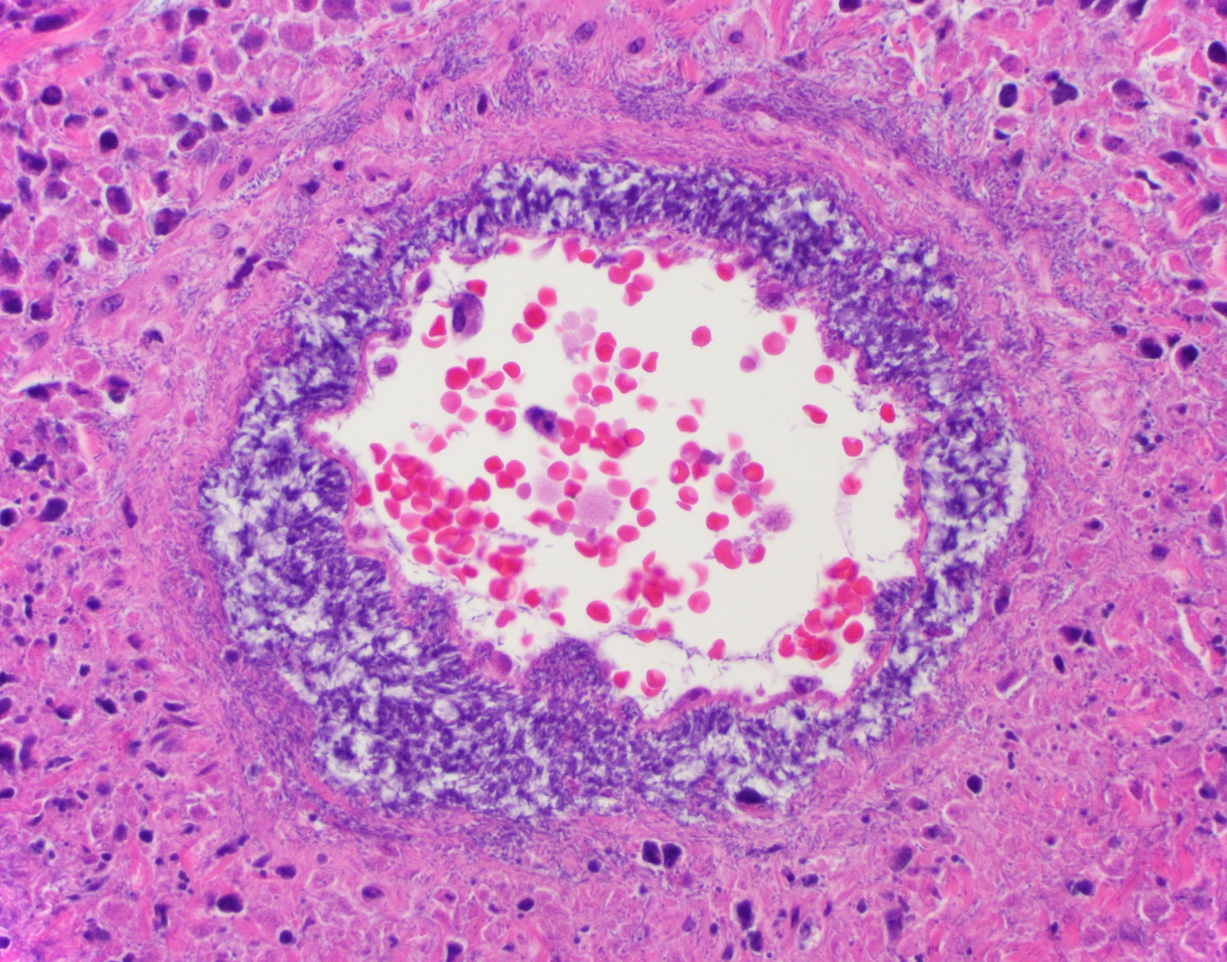 - Vasculature, gallbladder and liver: Marked, acute, multifocal endothelial necrosis with mural bacterial colonization, bacteremia, and fibrin thrombi