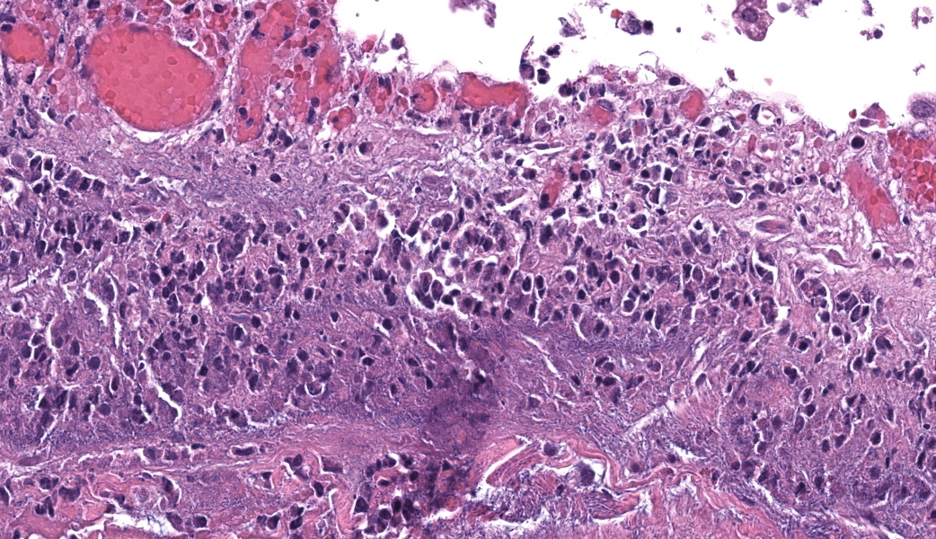- Gallbladder: Severe, acute, multifocal to coalescing, necrotizing and suppurative, transmural cholecystitis with hemorrhages, congestion, polymerized fibrin, edema, and intralesional bacilli