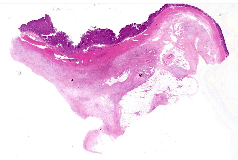 Despite being able to reach a diagnosis, most participants struggled with the specific anatomic location for this tissue. After much back and forth, the consensus amongst conference-goers was that this is likely representative of the ileocecal junction or close to it, since there are features of both small and large intestine on opposite ends of the H&E slide. While there are crypts, mucus glands, and subcutaneous fat consistent with large intestine visible on one side, there are also villi on the other, most clearly seen associated with and around the neoplasm.