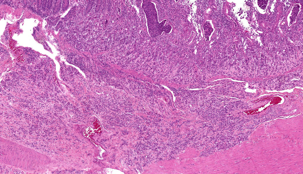 This last case is a classic! Many thanks to the contributor for a great submission and write-up. Most participants were readily able to reach a diagnosis of intestinal adenocarcinoma in this case due to the high mitotic rate, degree of invasion the neoplasm into abluminal tissue layers, and the striking desmoplastic response. The deep infiltration from the mucosa outwards allows for a strong argument of a primary intestinal adenocarcinoma rather than a metastatic carcinoma. Intestinal adenocarcinomas tend to invade from the mucosa deep into and run laterally through the submucosa and subsequent layers.