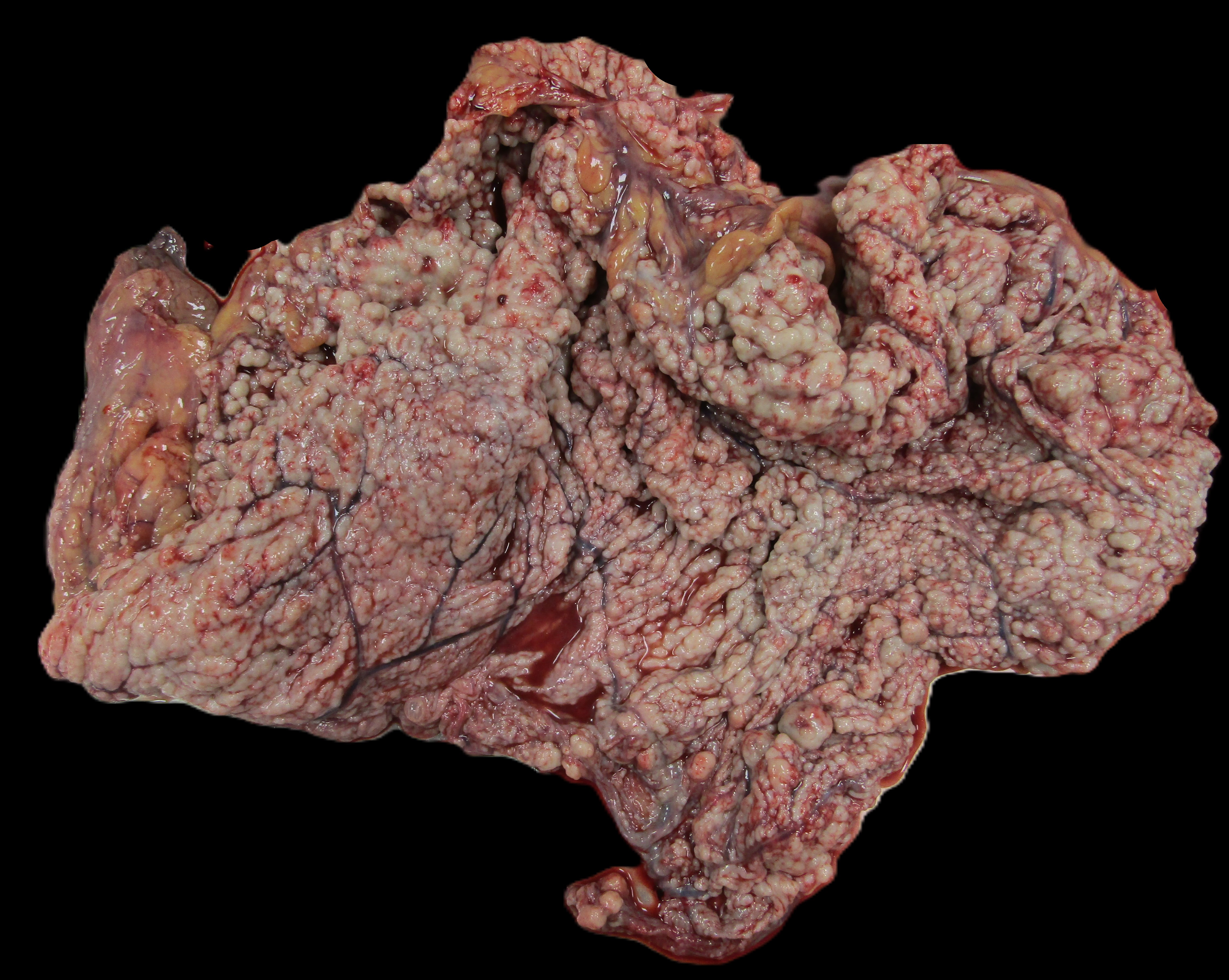 Externally the animal was emaciated. There was 24.5L of red watery peritoneal fluid, and 500ml of red watery pleural fluid. There were multifocal to coalescing exophytic, papillary, white nodules ranging from pinpoint to 5x5x2cm on the abdominal and thoracic body walls, the diaphragm, the omentum, the mesentery, the lung, the liver, the spleen, the peri-renal adipose tissue, and the ovary. The nodules were frequently associated with multifocal to coalescing hemorrhages.