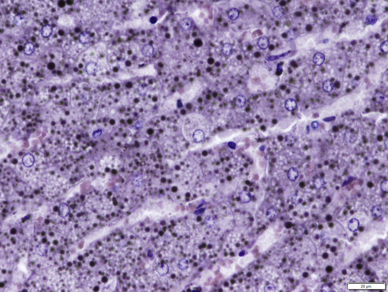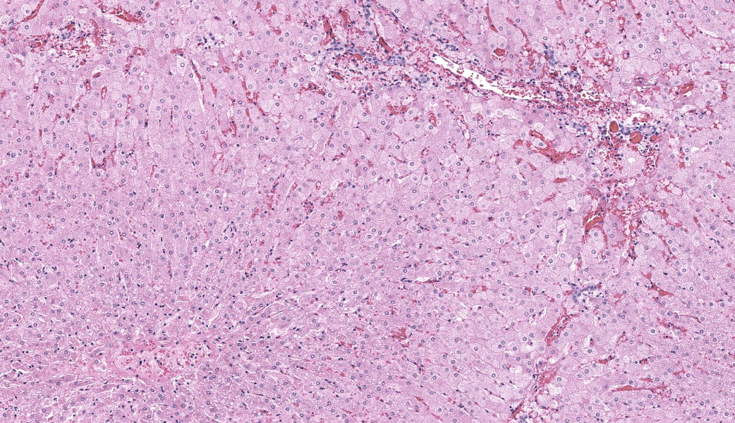 Liver: Diffusely, hepatocytes are moderately swollen and contain numerous small (~1µm) discrete to coalescing cytoplasmic vacuoles (microvesicular hepatopathy). Nuclei remain centrally located. Within the centrilobular interstitium, hepatocytes are occasionally individualized, rounded, shrunken, and/or hypereosinophilic with karyolysis (necrosis). There is mild, patchy periportal hemorrhage.